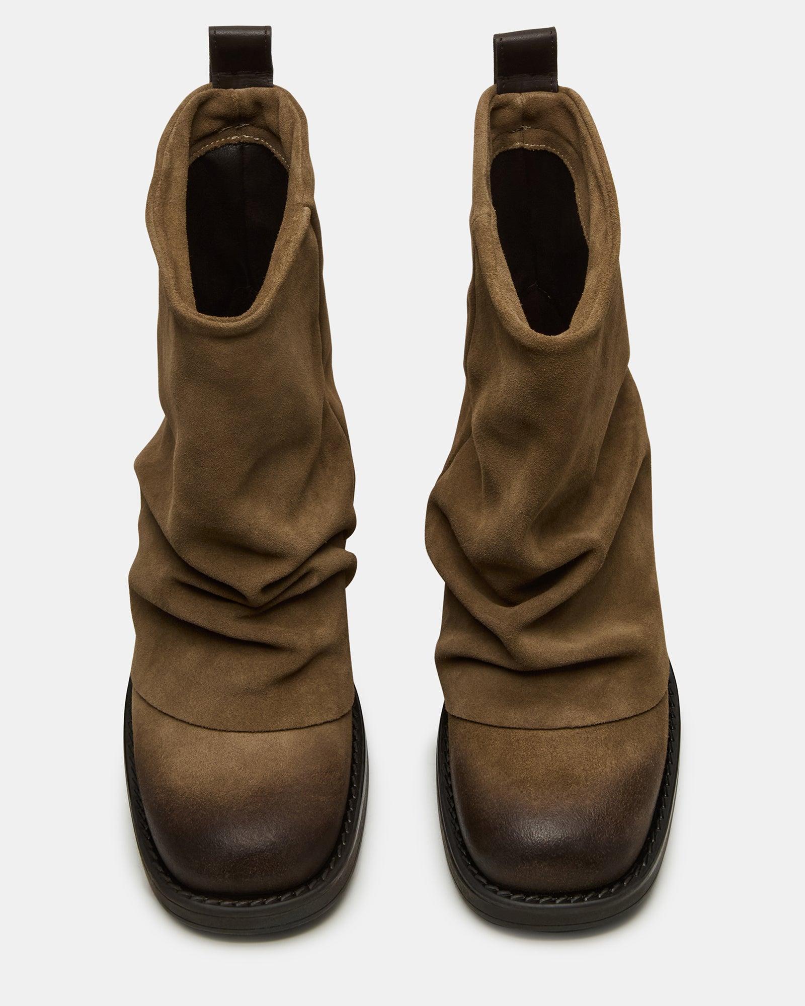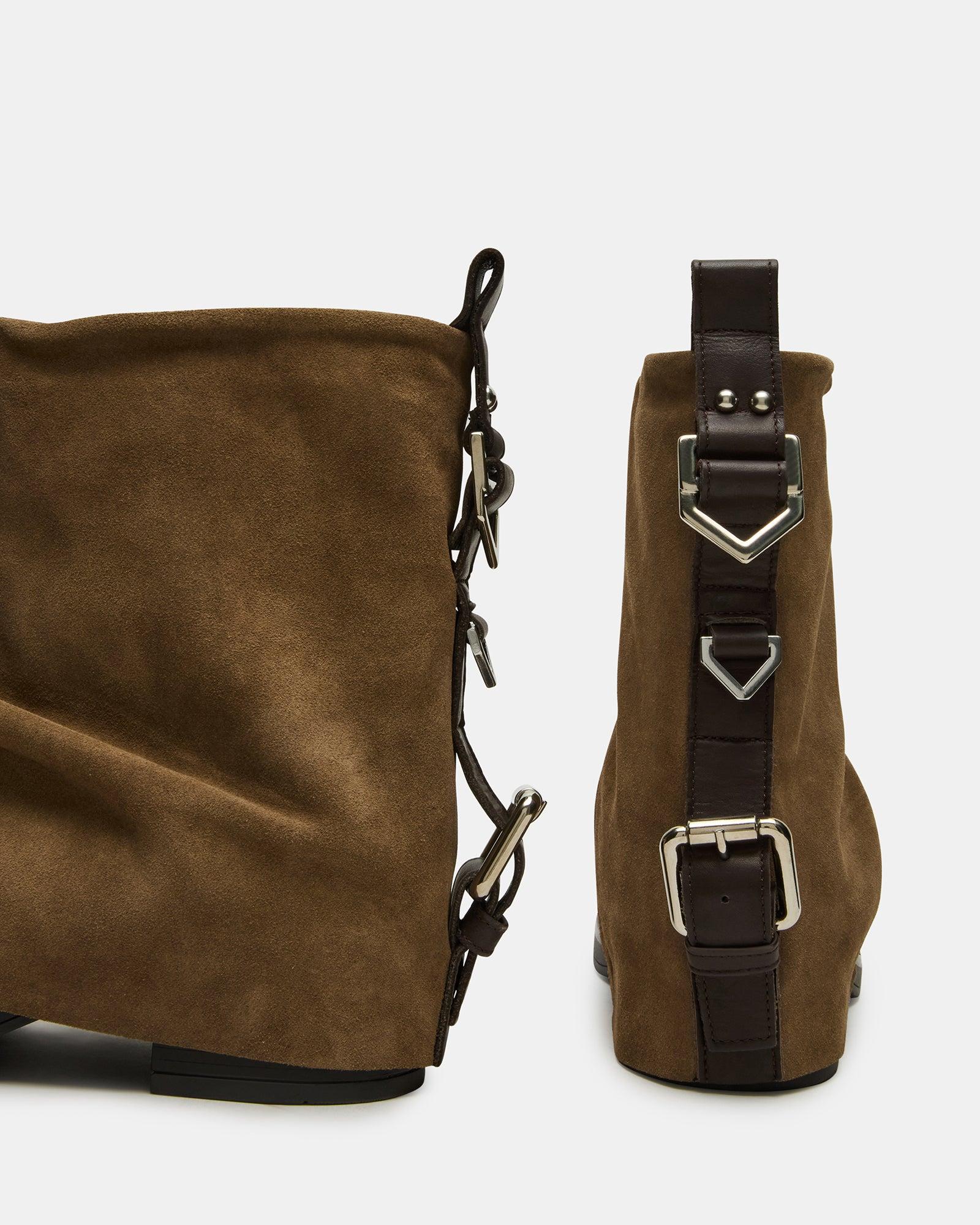 The BENJI ankle boot features a sophisticated cuffed fold-over design combined with a sleek moto-inspired silhouette. Its unique buckle detail on the back adds a distinctive edge, blending style with subtle functionality. Crafted for both comfort and statement-making appeal, this bootie elevates any outfit with expert craftsmanship and contemporary flair. 1.75 inch heel height 13.75 inch shaft circumference 6.5 inch shaft height Suede upper material Synthetic lining Synthetic sock Synthetic sole Fit tip: If you are in between sizes, size up a half-size Imported