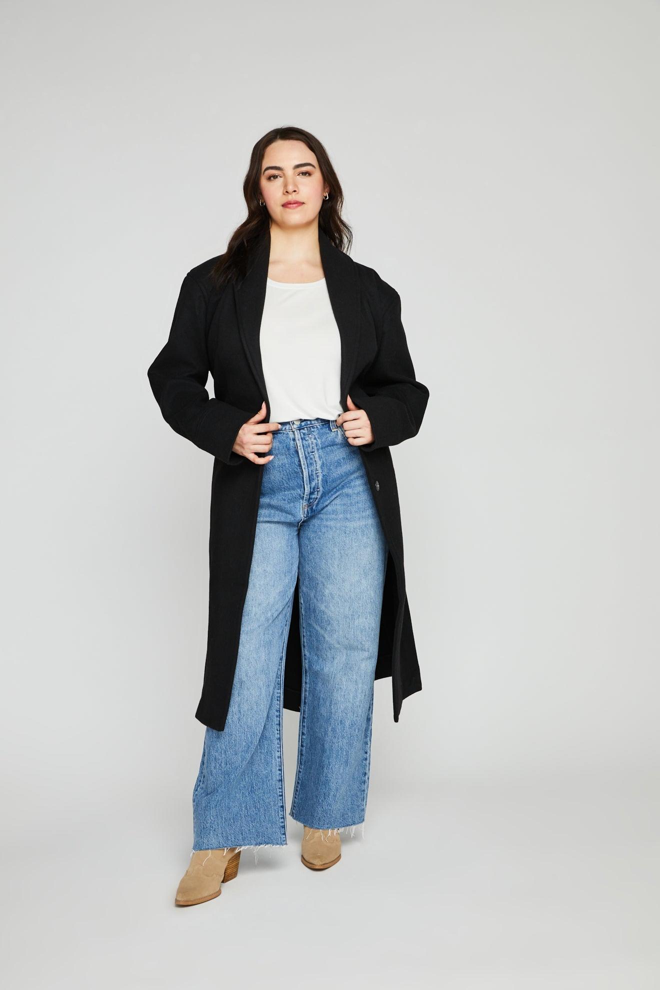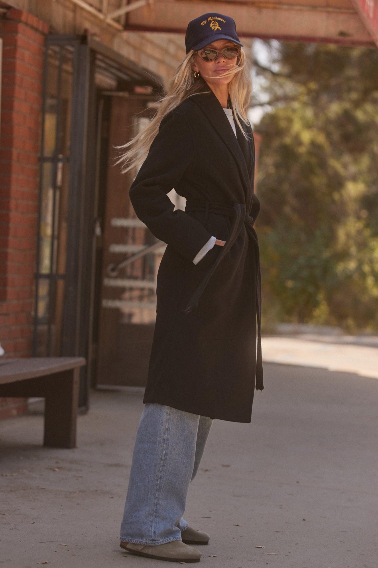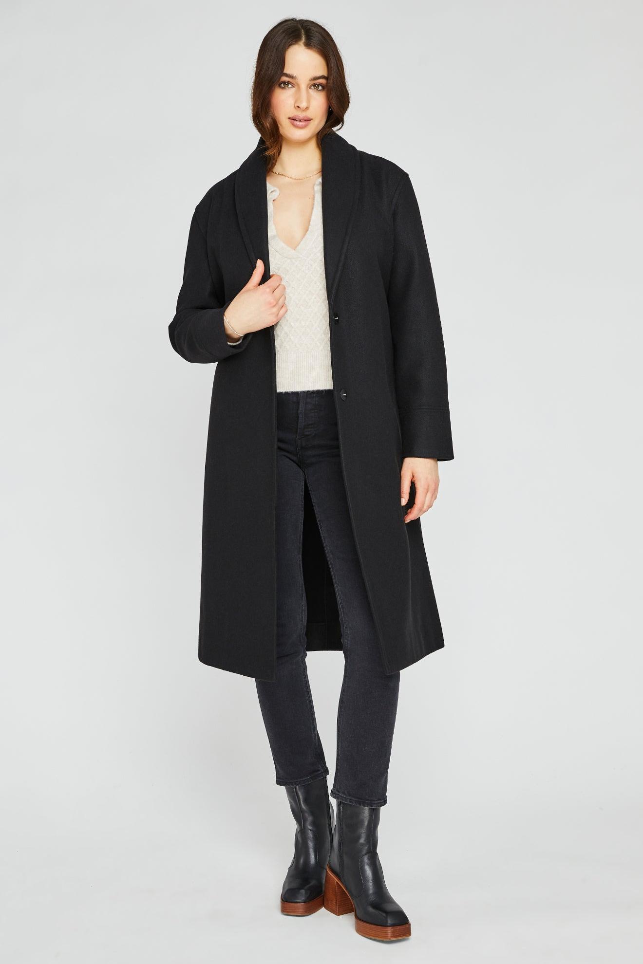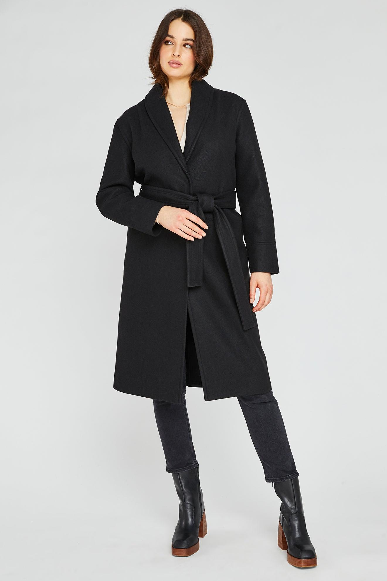 The Bennet coat is made of a soft brushed fabric. Features include a shawl collar and removable belt for a cozy and relaxed feel. DETAILS Relaxed Fit Inseam pockets Functional hidden snap closure Removable belt Back vent MATERIALS 90% Polyester 10% Rayon CARE Dry Clean Only SIZING Models 1-4 are 5'8" and wearing size S