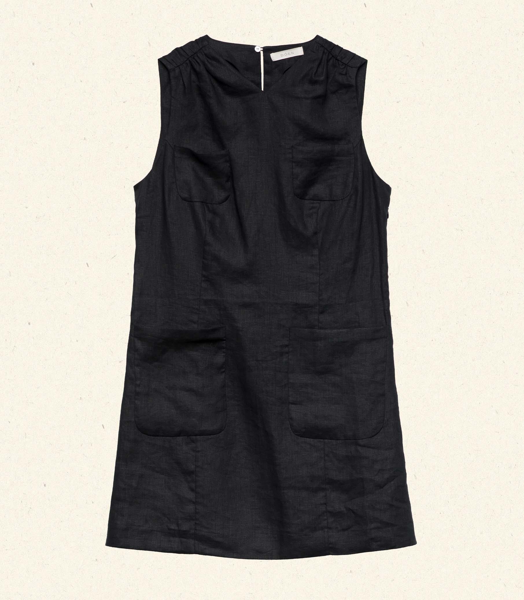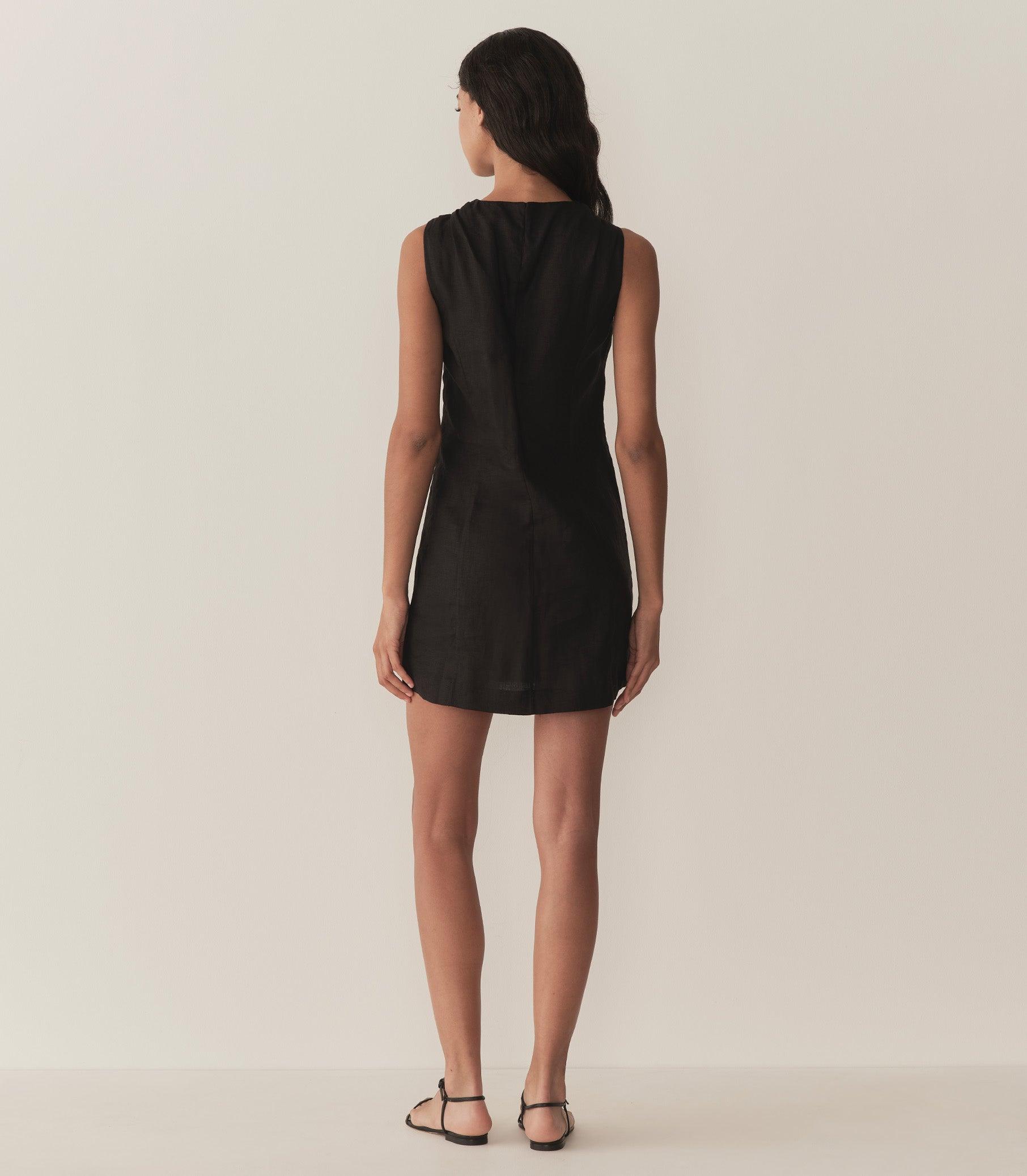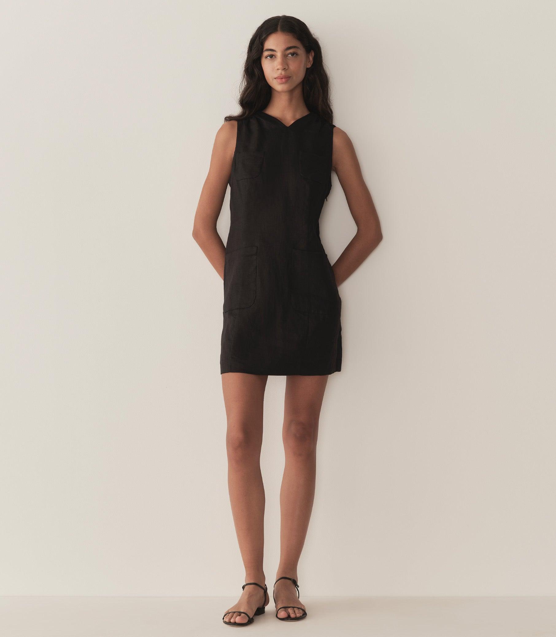 Tailored in soft, midweight linen, the Bennette is a ‘60s-inspired mini shift dress with a high V-neck, a subtly nipped-in waist, and a hem that falls just above mid-thigh. Light shirring at the shoulders lends subtle volume, and a mother-of-pearl button fastens at the back neck. Patch pockets detail the chest and waist, and an invisible side zipper offers the perfect fit.