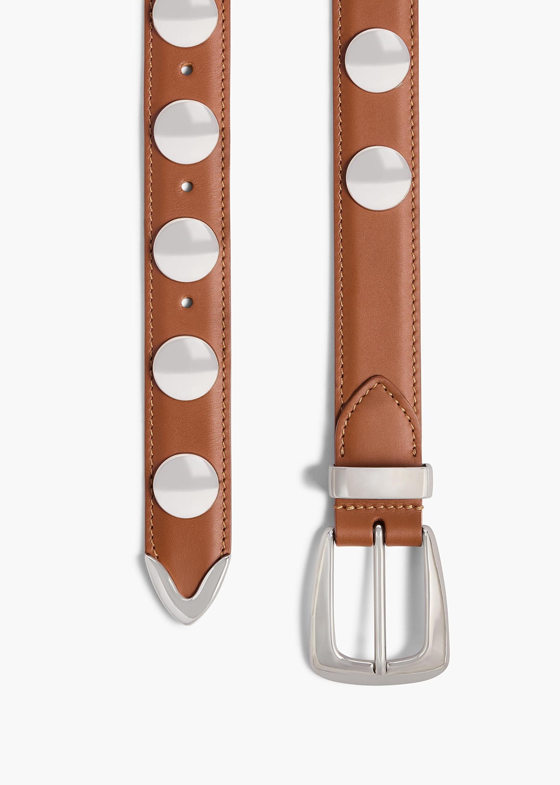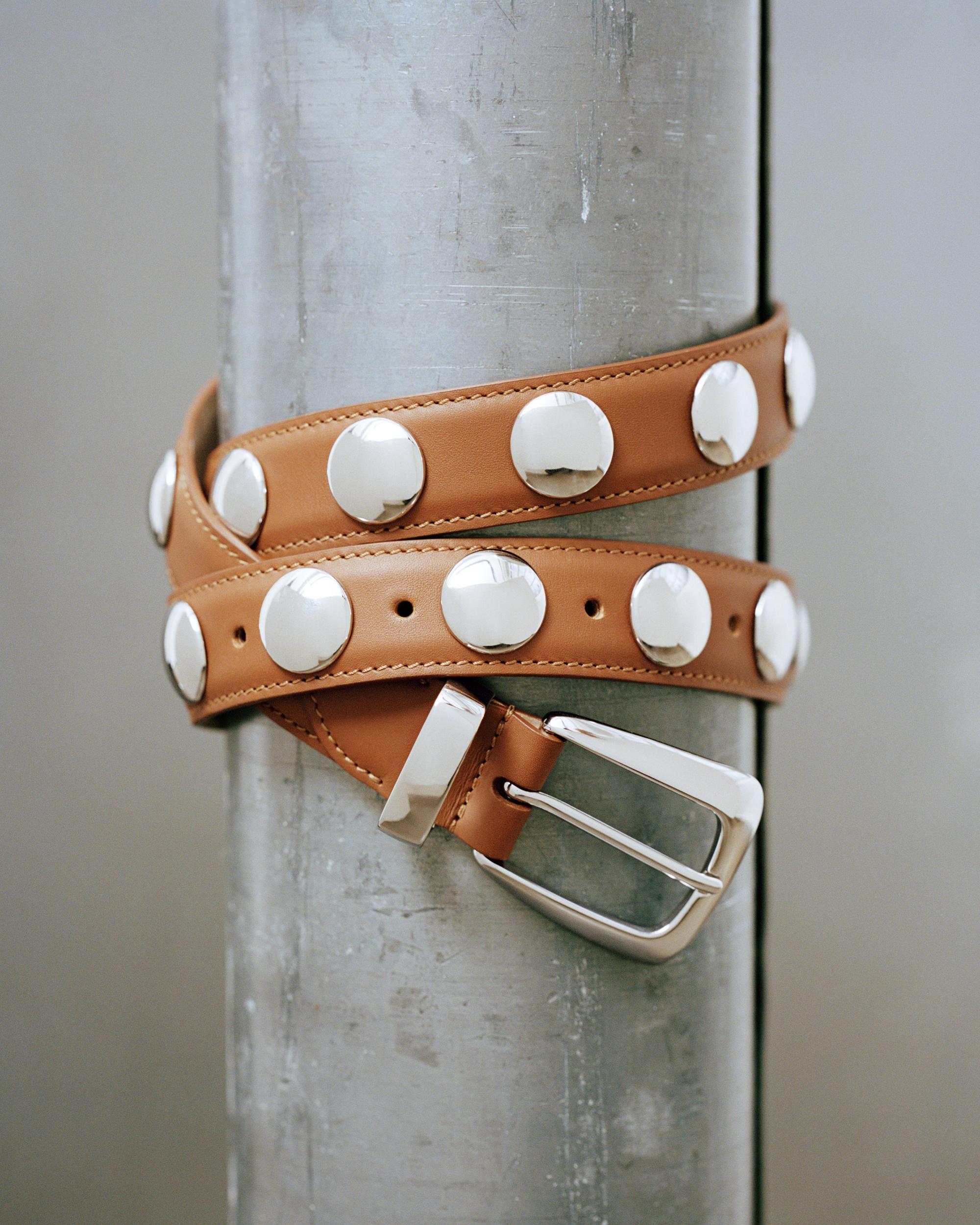 A refined and versatile belt made memorable by jewelry-like hardware—domed studs and a boldly formed buckle, loop, and tip—in palladium-plated brass.