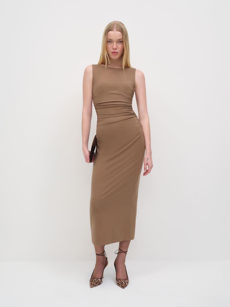 Get some compliments. Shop the Benson Knit Dress from Reformation, a sleeveless midi dress with a boat neckline and ruching throughout.