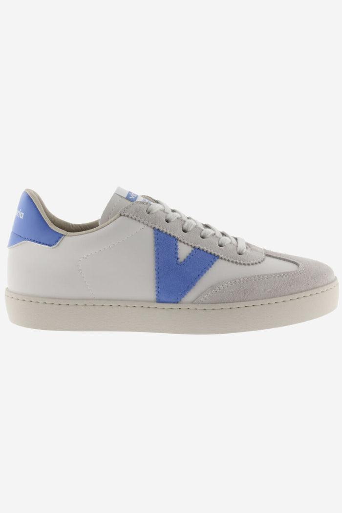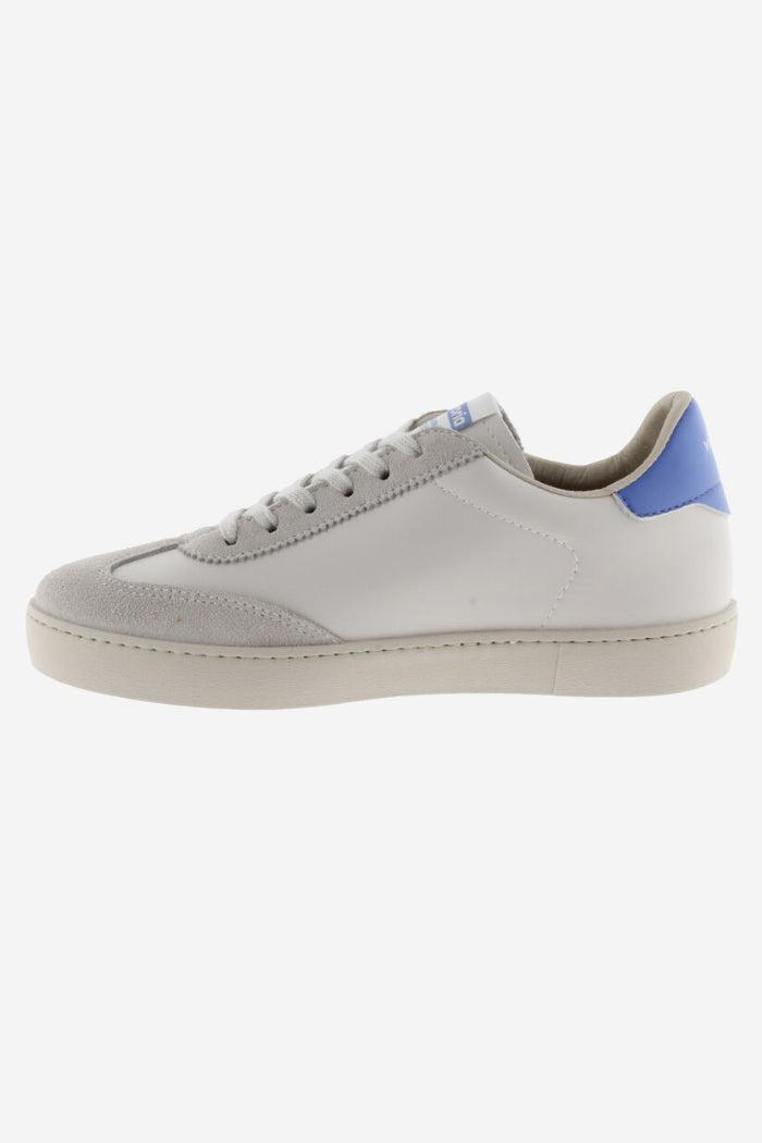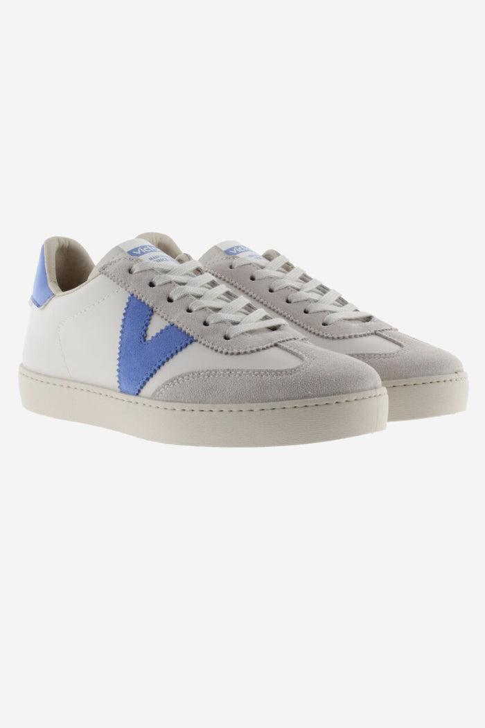 White trainers made in Spain in faux leather and split leather panels. Colour details on the V on the side and back and new cyclist cut at the toe, for added style. Light brown sole made with vegetable oils rather than mineral oils, true to our commitment to the environment. Every pair of shoes also features a more ergonomic insole made from recycled materials.