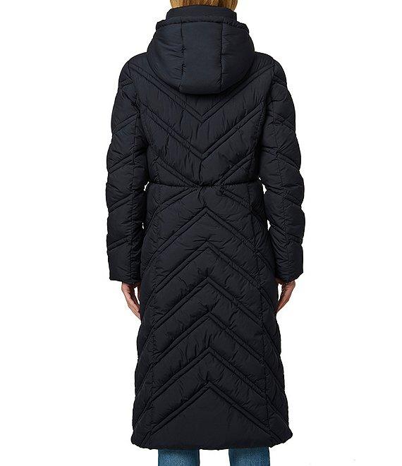 From Bernardo, this coat features: Puffer silhouette Chevron quilt pattern Attached hooded collar neckline Long sleeves Front seam pockets Heavyweight Water repellent Polyester fill Slim fit Fully lined Straight hemline Zip front closure Approx. 44.5" length Recycled polyester; lining: recycled polyester Machine wash Imported.