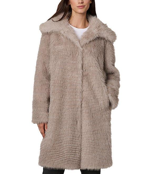 From Bernardo, this coat features: Faux fur fabrication Single breasted silhouette Oversize point collar neckline Long sleeves Angled welt pockets Midweight Classic fit Fully lined Straight hemline Hook front closure Approx. 37.5" length Polyester; lining: polyester Dry clean Imported.