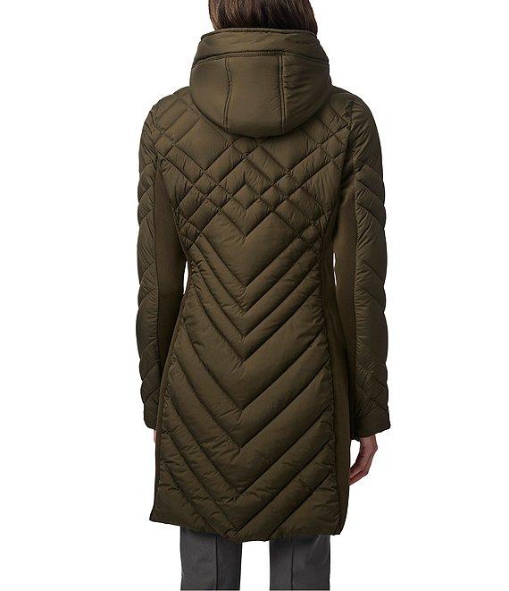From Bernardo, this coat features: Lattice quilt fabrication Stand collar neckline Long sleeves with thumb hole cuffs Two zip pockets Zip off bib hood Neoprene size panel Fully lined Straight hemline Zip front closure Approx. 36 1/2" length Recycled polyester/polyester/rayon/spandex Machine wash/tumble dry Imported.