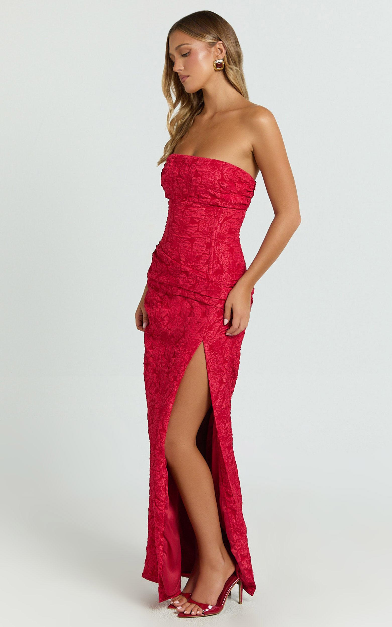Transform your look with the Berri Maxi Dress – your new go-to for statement-making moments. This stunning strapless maxi dress features a bold red jacquard fabric that hugs your curves in all the right places, combining elegance and edge for an unforgettable cocktail-ready vibe. The dramatic high split adds a flirty touch, giving you the freedom to move with confidence and showcase your style.Product Details:Jacquard fabricStrapless necklineFitted maxi silhouetteInner lining includedZip closurePerfect for cocktailsPolyester materialSize and FitSize S / 8 length: 133cm / 52.36inStudio model is wearing size XS / 6 AU / 2 US / 6 UK / 34 EUStudio model's height is 174cm / 5'9''Material and CareMain Fabric: 95% Polyester, 5% Spandex Lining: 96% Polyester, 4% SpandexLow Stretch