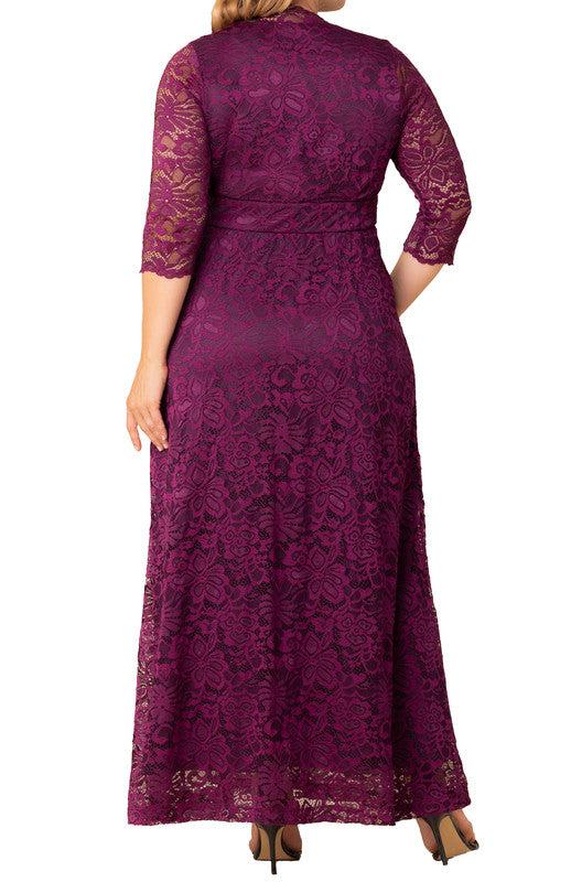 The Maria Lace Evening Gown is a long formal gown crafted from stretch floral scalloped lace and designed with an A-line silhouette, surplice neckline, pockets, and 3/4 sleeves. Perfect for weddings guests, galas, formal events, mother of the bride or groom, and other special occasions and parties