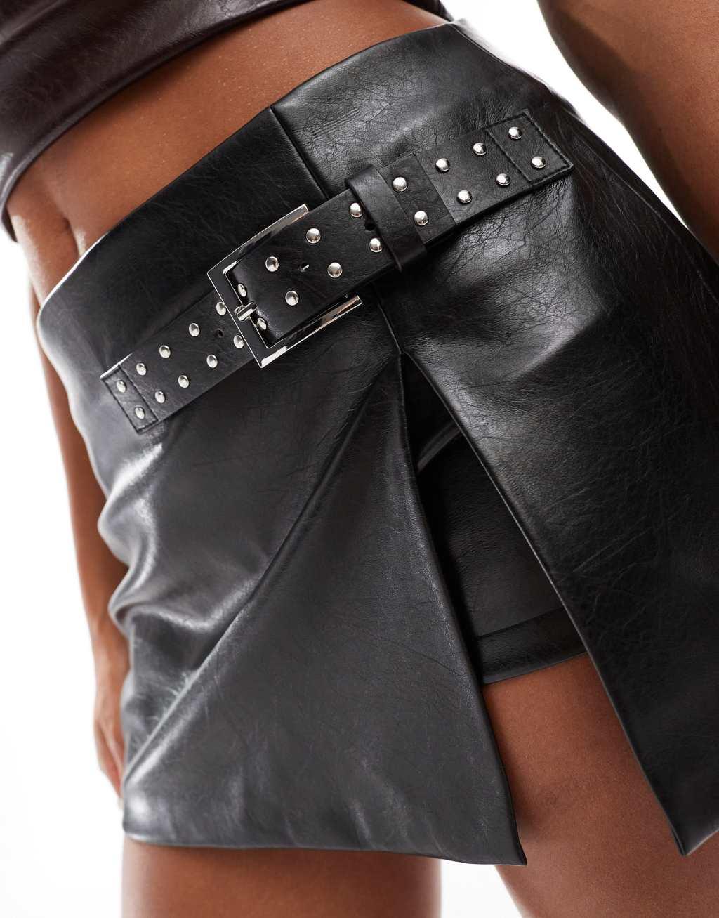 Grey Washed Faux Leather Low Rise Seam Detail Micro Mini Skirt