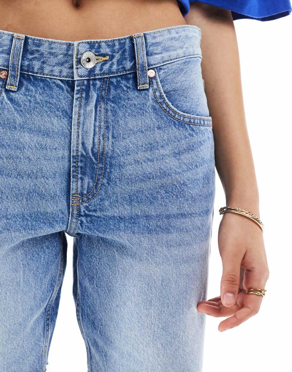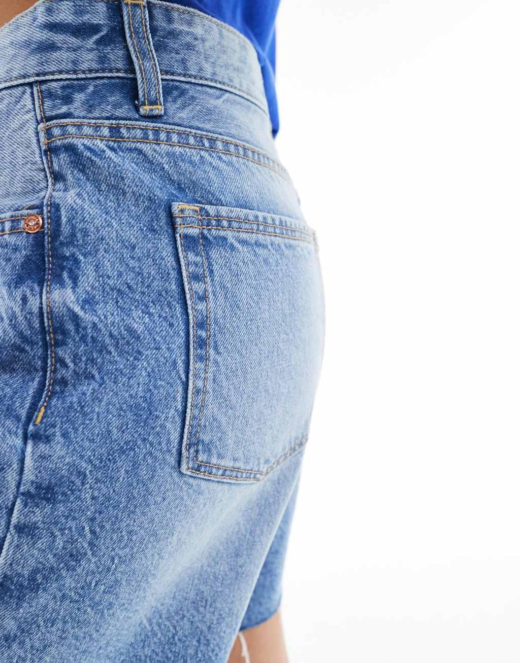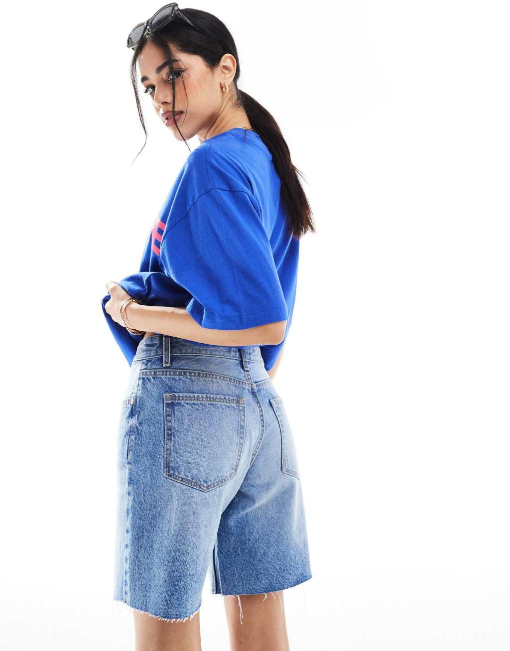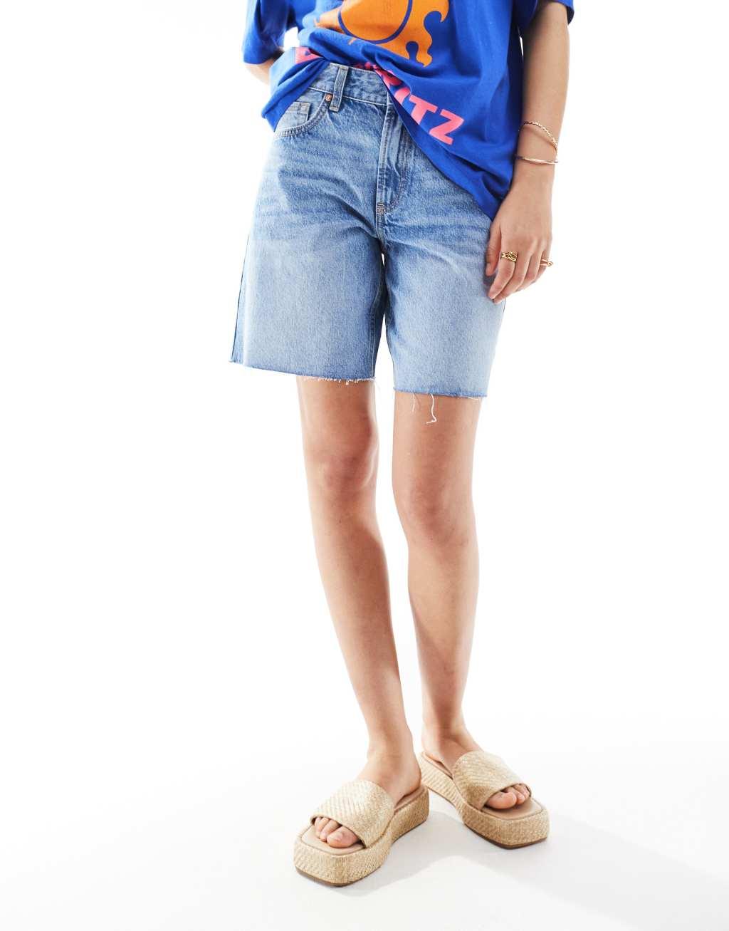 Bershka high waisted raw hem longline denim shorts in mid blue
