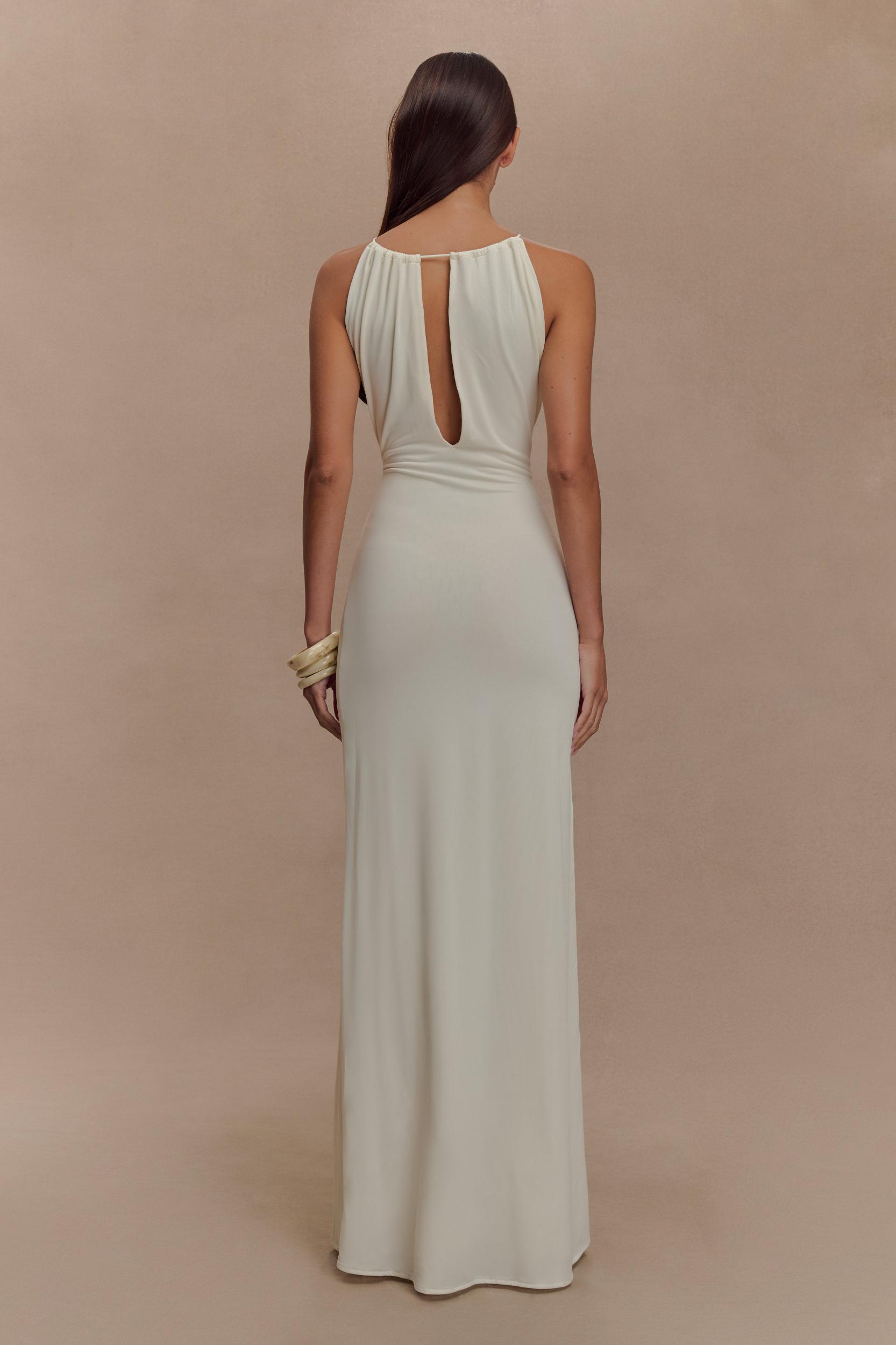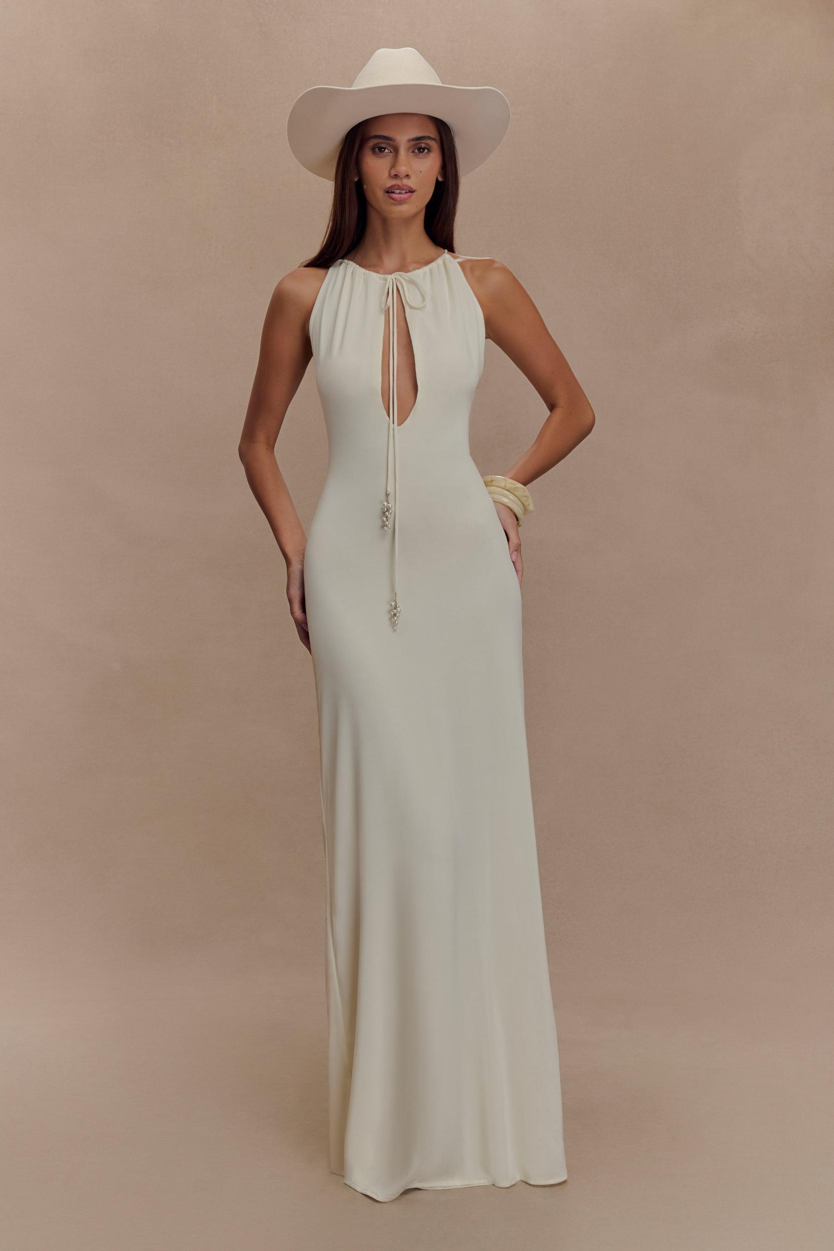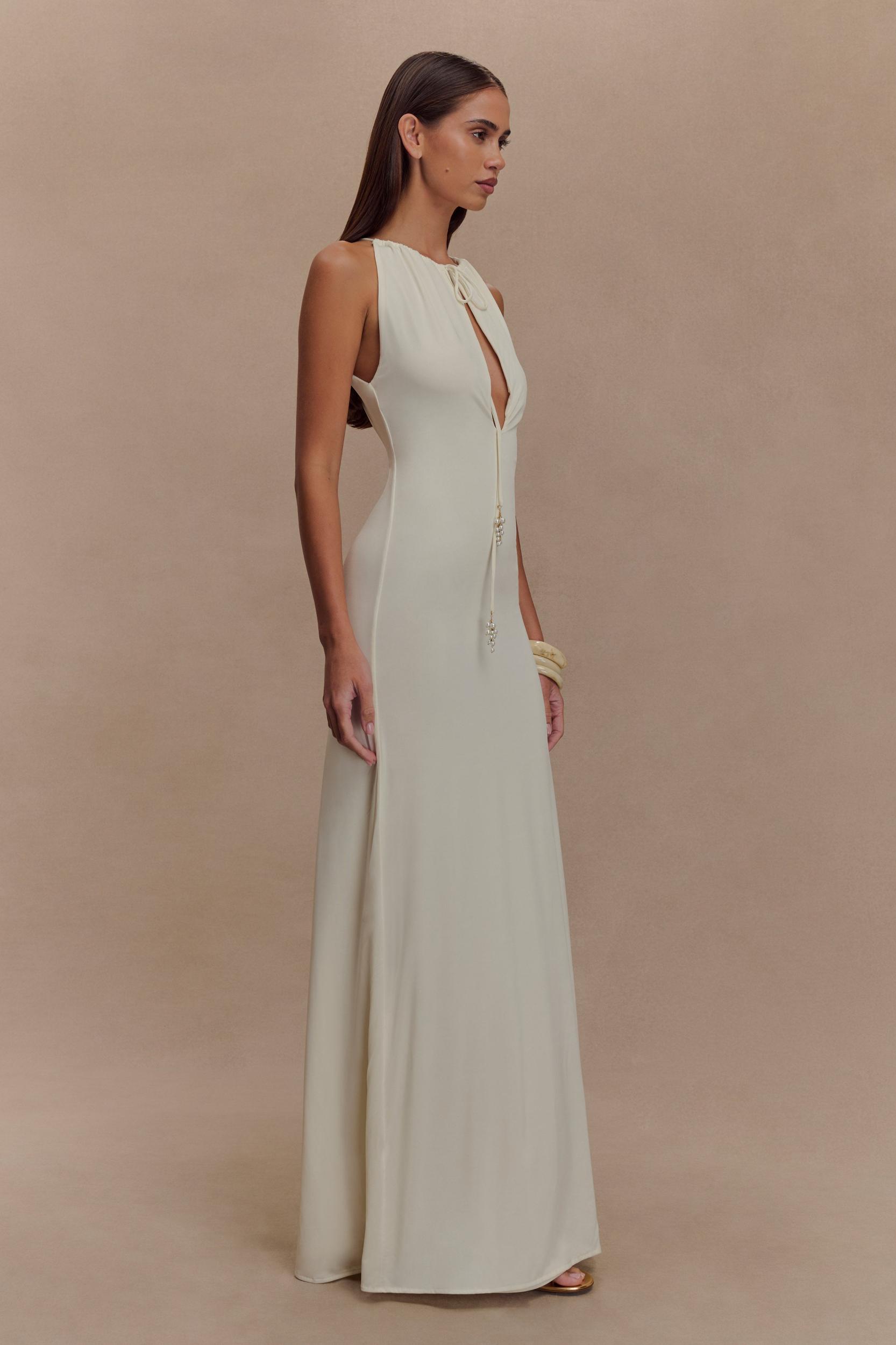 Drift into elegance. The BERYL Slinky Maxi Dress with Pearls is the epitome of effortless sophistication. Designed with a high gathered neckline that flows into a dramatic deep V plunge, this gown strikes the perfect balance between elegance and allure. The open V-back adds a striking touch, secured with delicate tie closures adorned with luminous pearls for a subtle yet stunning finish. Falling in a sleek straight-fit silhouette to a maxi length, this dress is perfect for evening occasions, modern bridal moments, or any event where timeless glamour takes centre stage.