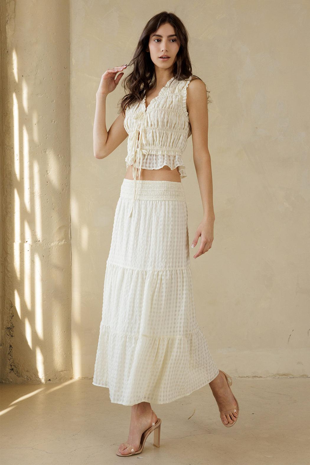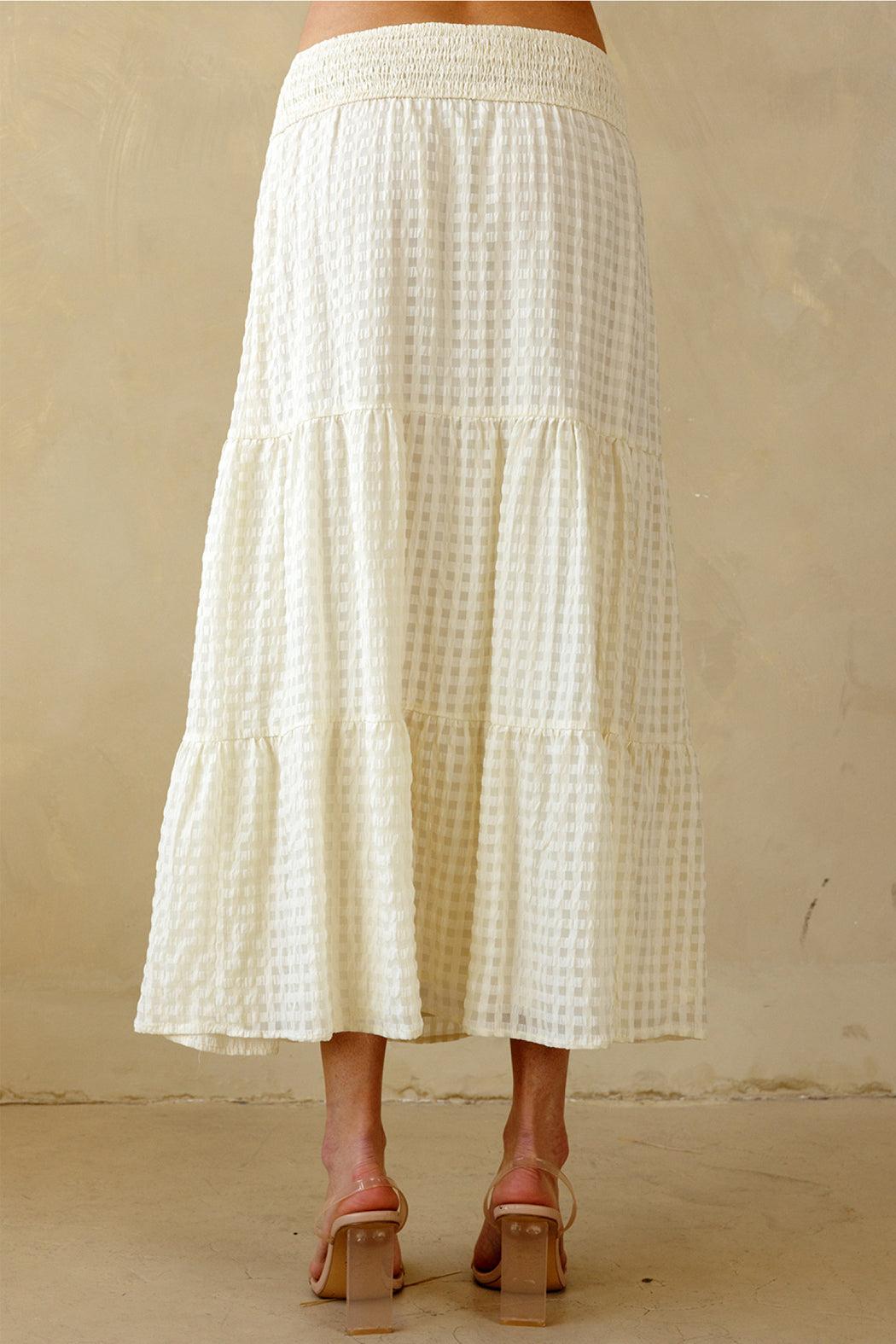 Milkmaid style is in this summer and the Bessie Tiered Midi Skirt meets all the requirements. In a pale butter yellow color, this midi skirt features a thick smocked waist band that can be worn high or low rise, and a tiered flowing skirt with checkered design. Pair with sneakers and a white tee for a laid back look.