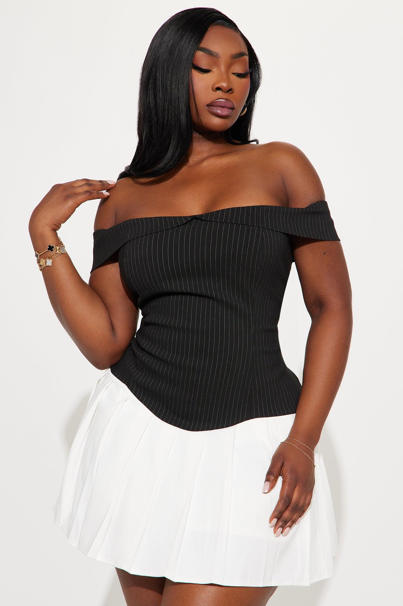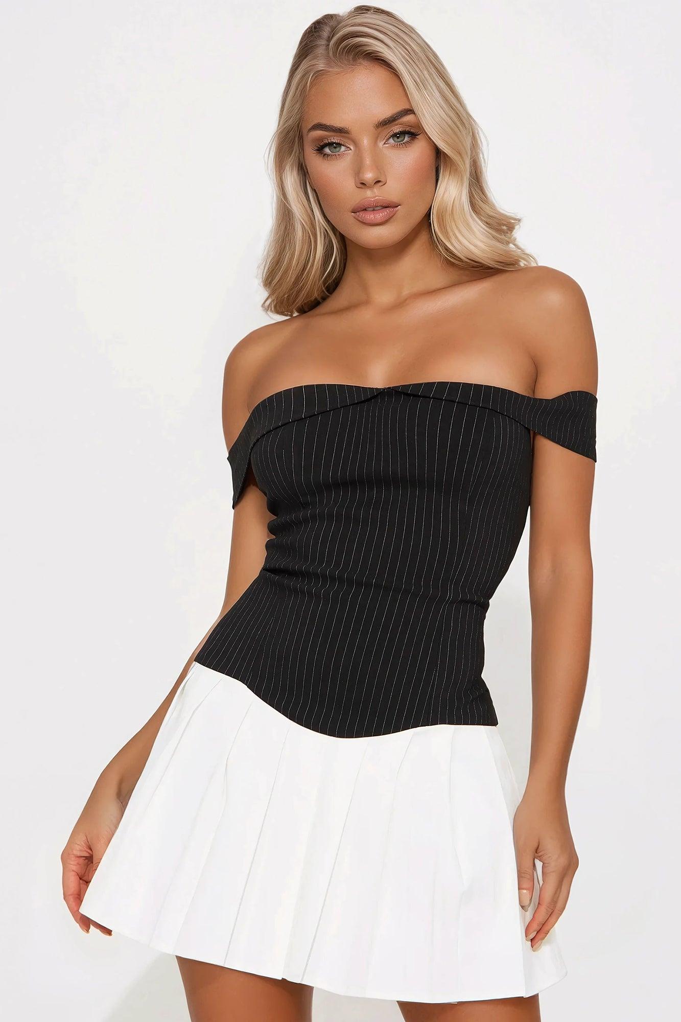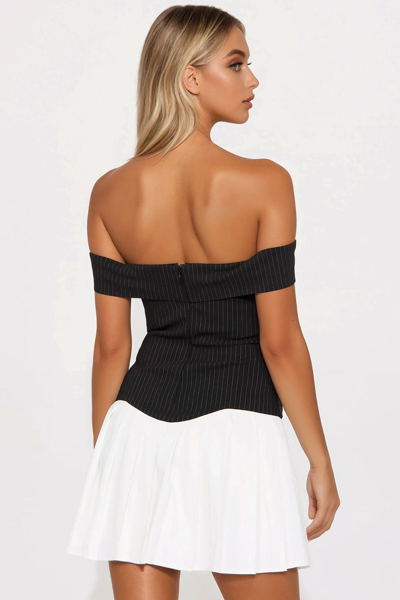 Available In Black/combo. Pinstripe Mini Dress Off shoulder Short sleeves Fold over detail Pleated Back zipper Lined Length measured flat = 32" Self 60% Rayon 36% Nylon 4% Spandex Contrast / Lining 100% Polyester Imported California Proposition 65WARNING: Cancer and Reproductive Harm - www.P65Warnings.ca.gov.