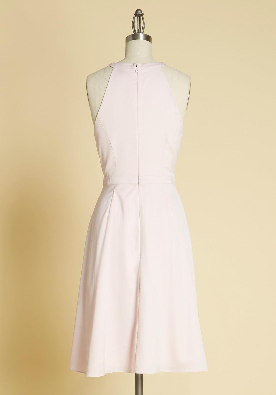 A light pink halter dress that tastefully brings together your favorite fashion elements? What luck! With its smooth satin construction, large keyhole detail, flowy A-line skirt, and 60s-inspiration, this sleeveless bridesmaid dress by our ModCloth label places your elegance right where everyone can appreciate it. Shell: 97% Polyester, 3% Spandex. Lining: 100% Polyester. Machine wash. Fully lined. Back zipper with hook and eye closure. Imported Model is wearing size:4 Fabric does not provide stretch. 4=39 inches Length 18=41.5 inches Length