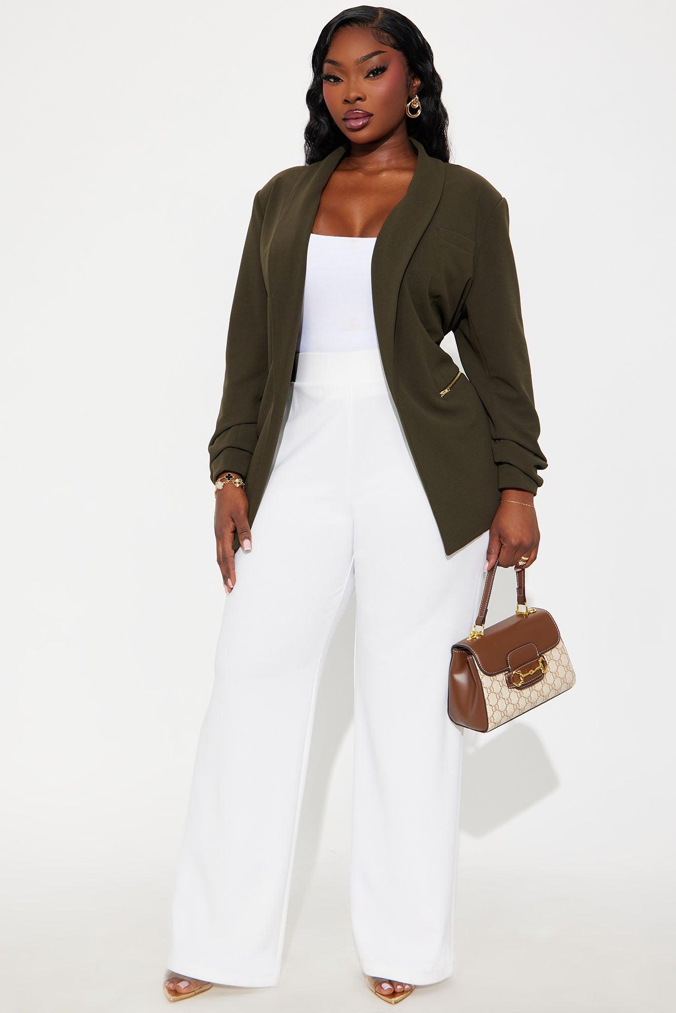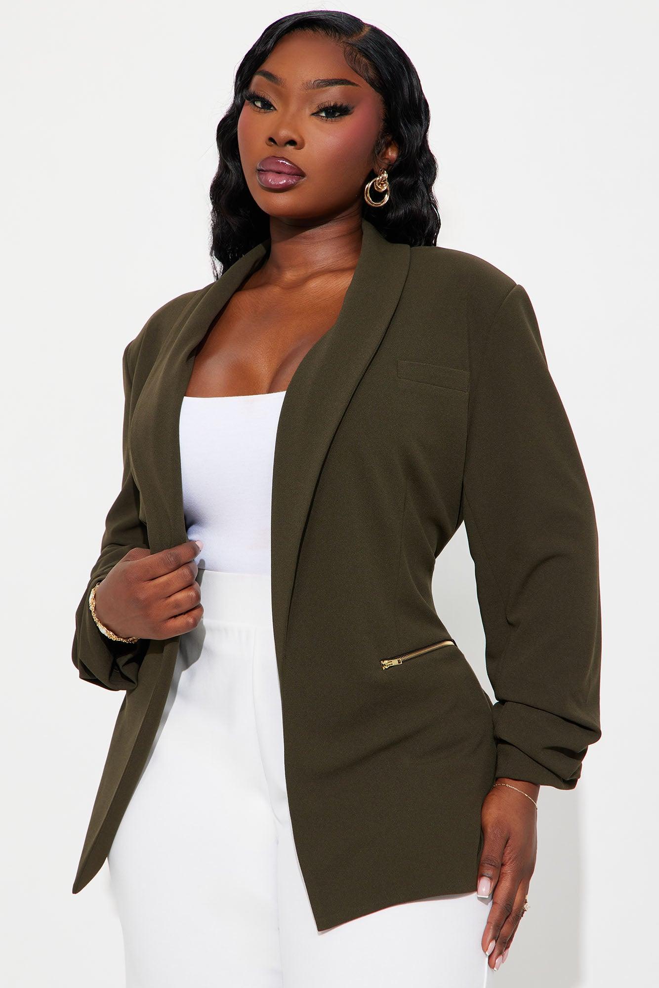 Available In Black, Navy And Olive. Blazer Lapel Collar Long Sleeve Crepe Knit Padded Shoulders Ruched Sleeve Open Front Lined Shell: 95% Polyester 5% Spandex Lining: 100% Polyester Imported