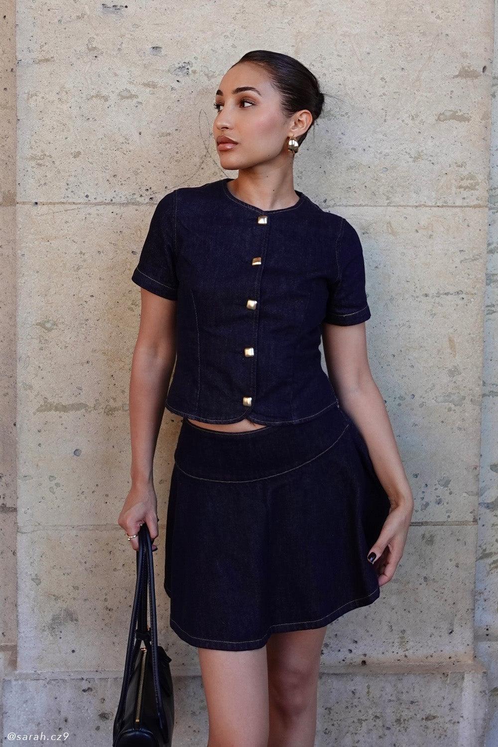 Chicly done. The BETHANY Short Sleeve Buttoned Denim Top is a fresh take on structured femininity. Featuring a sleek round neckline and short sleeves, this fitted design flatters the figure while front and back paneling add a touch of modern tailoring. The flared hem shape creates a soft, feminine finish, while custom mismatched buttons bring a unique and playful detail. Pair it with the Arista Denim Mini Skirt for a coordinated look that blends effortless charm with contemporary edge.