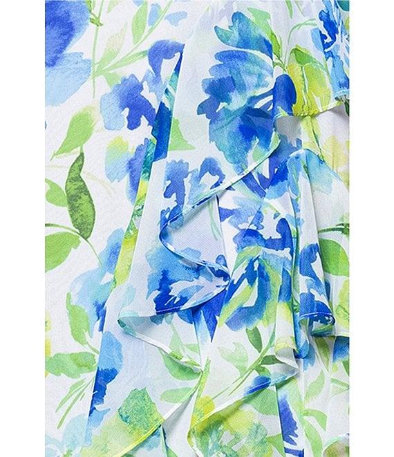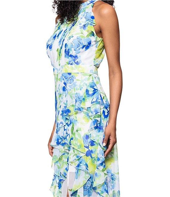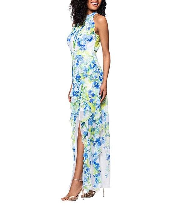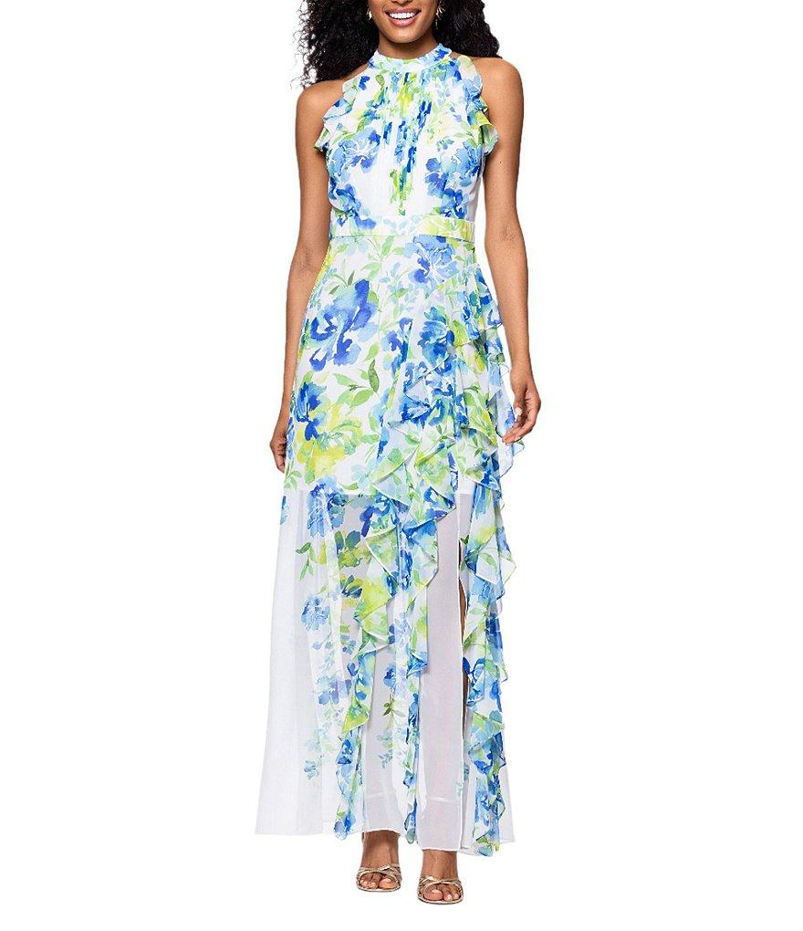Betsy & Adam Chiffon Floral Print Halter Neck Sleeveless Ruffle Fit and Flare Maxi Dress