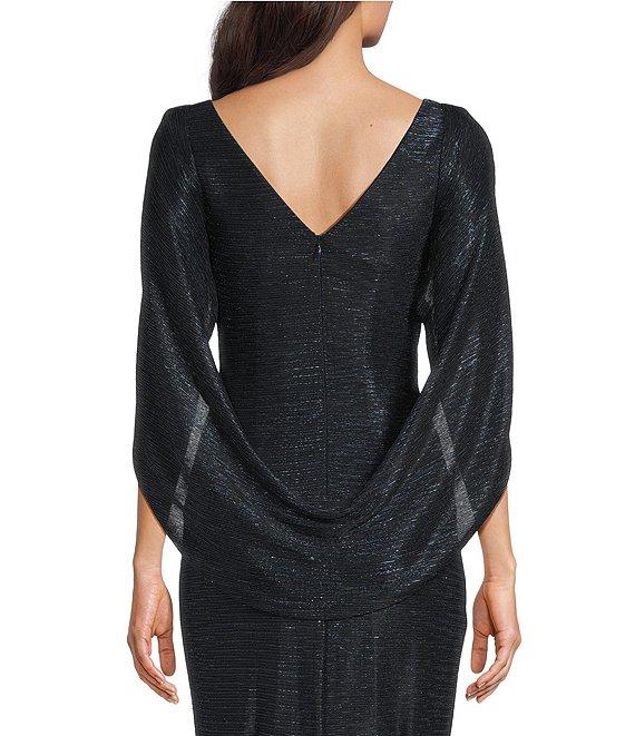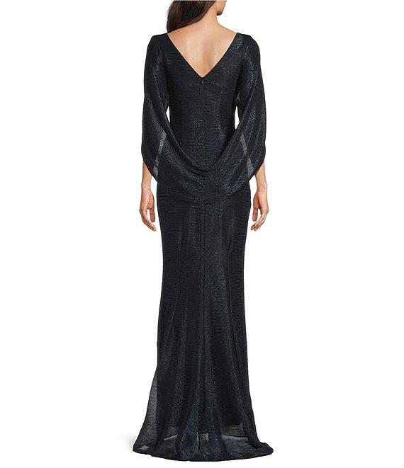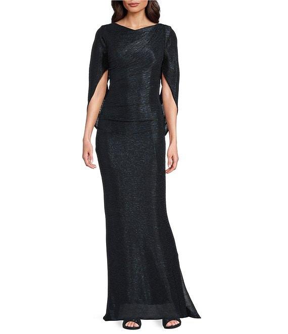 From Betsy & Adam, this gown features: Metallic crinkled fabrication Sheath silhouette Round neckline 3/4 sleeves Drape back cape detail Ruched bodice Fully lined Invisible zip back closure Approx. 61" in length Polyester/metallic Spot clean Imported.