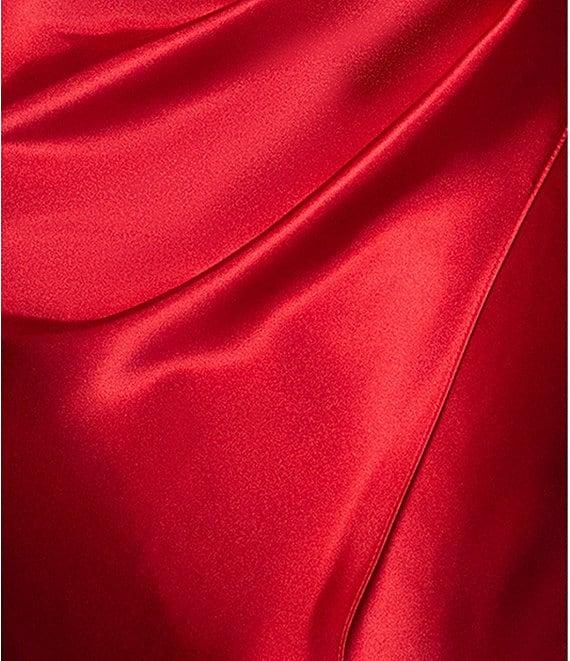 From Betsy & Adam, this dress features: Charmeuse fabrication Sheath silhouette Halter cowl neckline Sleeveless Side ruching Back ruching Zip back closure Approx. 61" length Polyester Dry clean Imported.