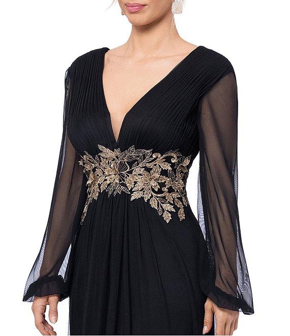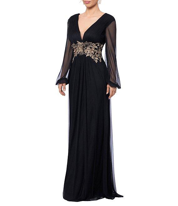 From Betsy & Adam, this dress features: Power mesh metallic applique fabrication A line silhouette V-neckline Long illusion sleeves Waist detailing Zip back closure Approx. 61" length Nylon Spot clean Imported.