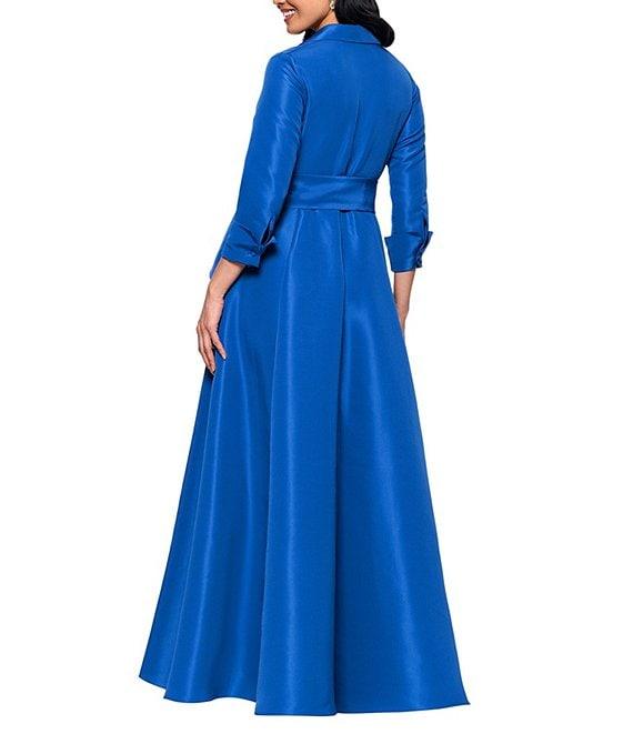 Betsy & Adam Long Sleeve Collar V Neck Taffeta Ballgown With Side Ruffle