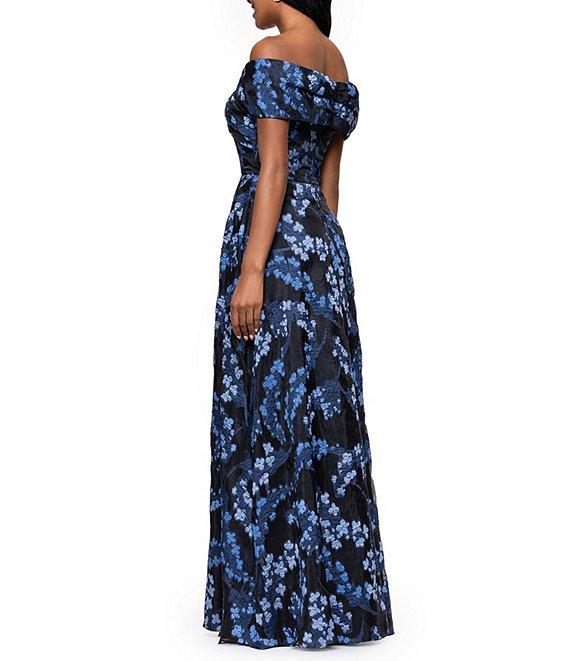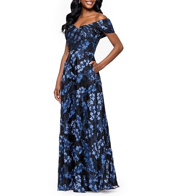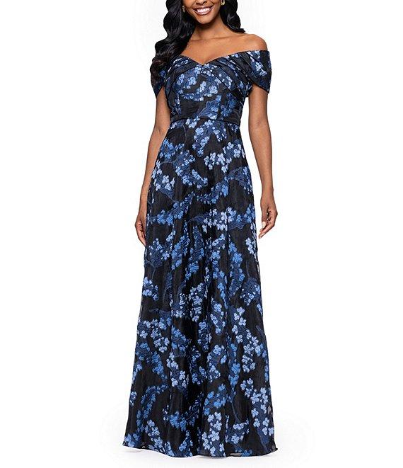 Betsy & Adam Organza Brocade Floral Off-the-Shoulder A-Line Gown