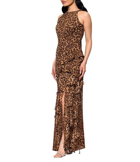 Betsy & Adam Petite Size Chiffon Halter Neck Sleeveless Ruffled Leopard Print Maxi Dress