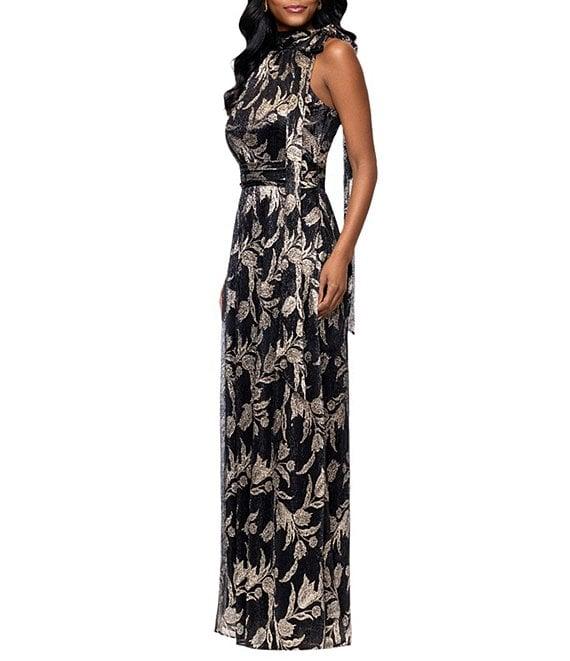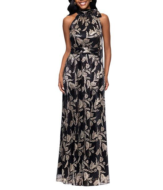 From Betsy & Adam Petite, this dress features: Halter neckline with a tie Sleeveless Sheath silhouette Lined Metallic print Side zip closure Approx. 56" in length from high point shoulder Polyester/metallic Spot clean Imported.