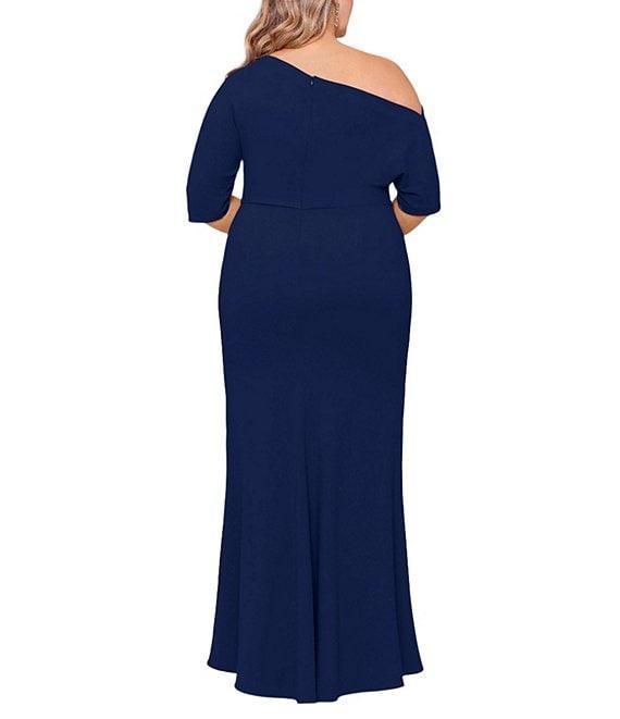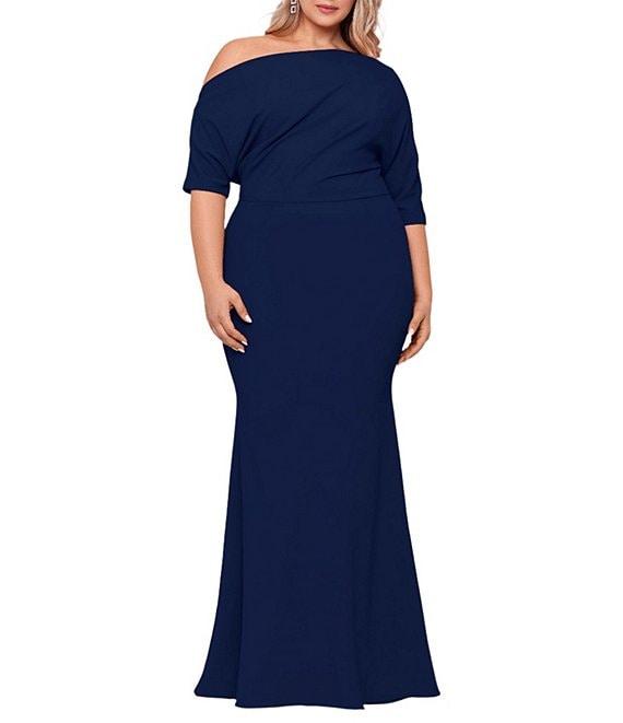 From Betsy & Adam Plus, this dress features: Scuba crepe fabrication Asymmetrical off-the-shoulder neckline Asymmetrical short sleeves Lined Center back zip closure Approx. 63" in length Polyester/spandex Dry clean Imported.
