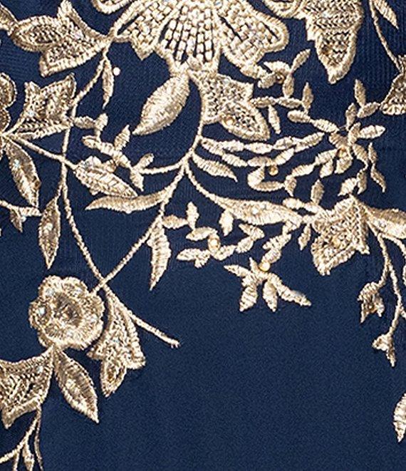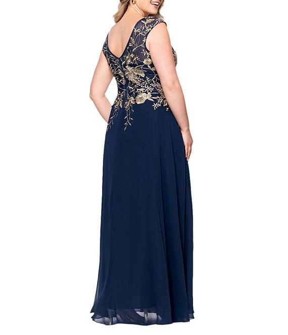 From Betsy & Adam Plus, this dress features: Chiffon fabrication A line silhouette V neckline Sleeveless Embroidered floral Side slit Zip back closure Approx. 60" length Polyester Dry clean Imported.