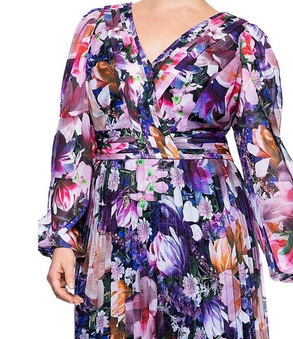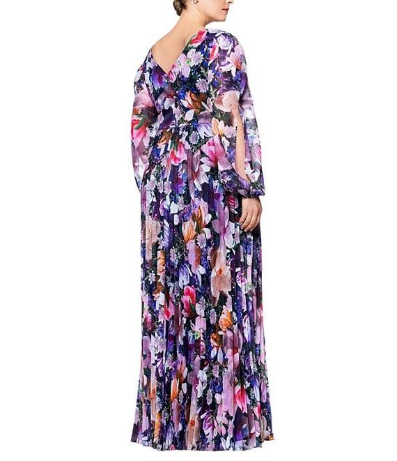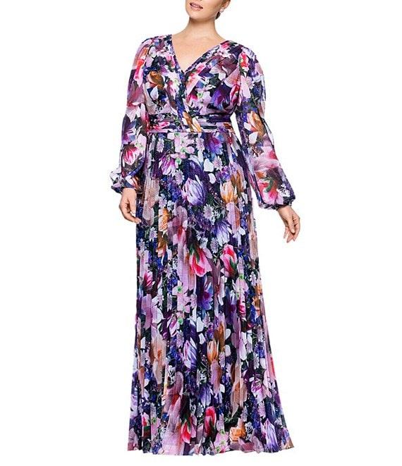 From Betsy & Adam Plus, this dress features: HMC fabrication Empire waist silhouette V-neckline Long sleeves Lined Pleated skirt Zipper back closure Approx. 63" in length Polyester Spot clean Imported.