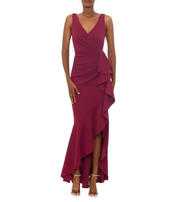 From Betsy & Adam Petite, this gown features: Scuba crepe fabrication Gown silhouette V-neckline Sleeveless Lined High/low cascade Side ruffle at waist Center back zipper closure Approx. 40" length Polyester/spandex Dry clean Imported.