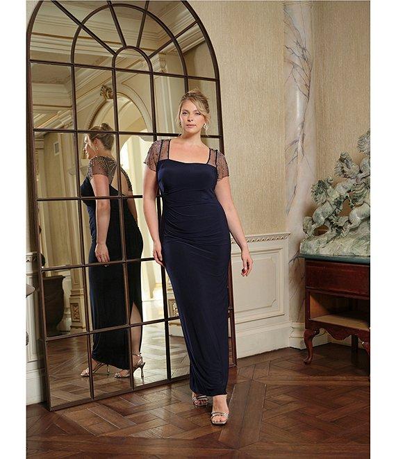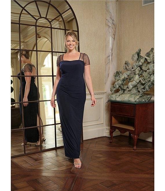 From Betsy & Adam, this gown features: square neckline short beaded sleeves open back fully lined center zip back closure Approx. 61.5 length from shoulder to hempolyester spot cleanImported.