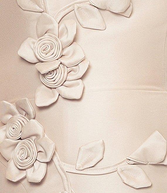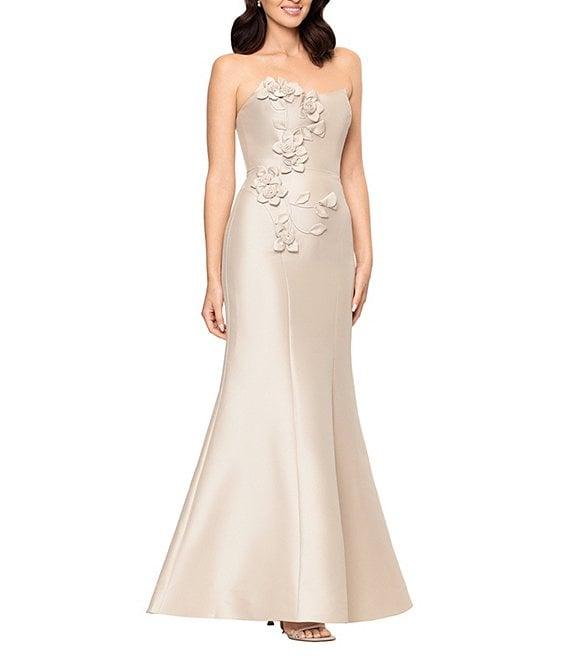 From Betsy & Adam, this dress features: Mikado fabrication A line silhouette Strapless Sleeveless Floral applique Corset bodice Zip back closure Approx. 60.5" length Polyester Dry clean Imported.