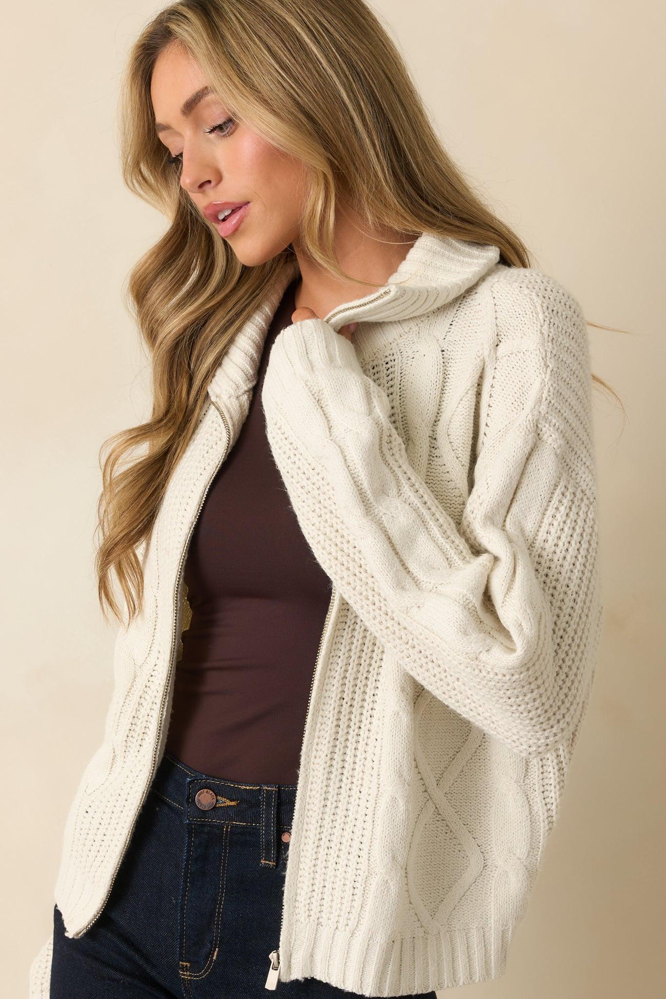 The Better Believe It Ivory Cable Knit Zip Front Sweater Jacket is as cozy as it is chic, giving you that effortlessly stylish layer you’ll be reaching for all season long. This ivory jacket features a cable knit sweater material, a fold over collar neckline, functional full zip front, long sleeves, and ribbed knit hems. 100% Polyester Unlined Hand Wash Cold Manufactured in China Designed in the USA Model is 5'8" and wearing size S/M