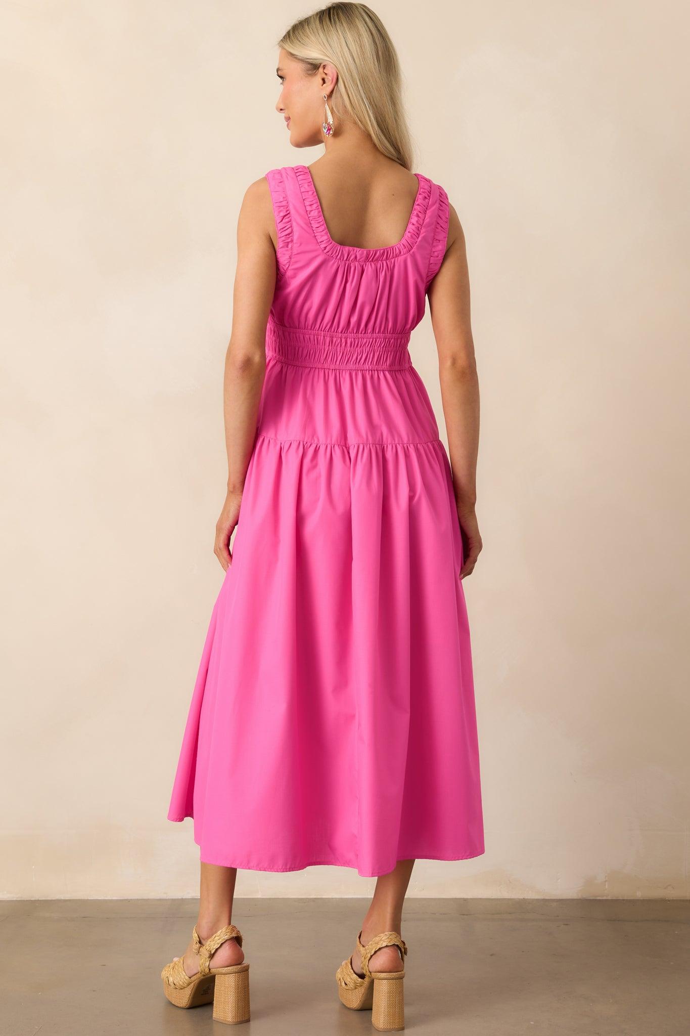 The Better Late Than Never Hot Pink Sleeveless Midi Dress brings an effortlessly elevated feel to your lineup—the kind of look that turns heads, no matter when you show up. This hot pink midi dress features a scoop neckline, functional o-ring zip front, sleeveless design, elastic ruched waist, ruched trim detailing, and functional pockets.