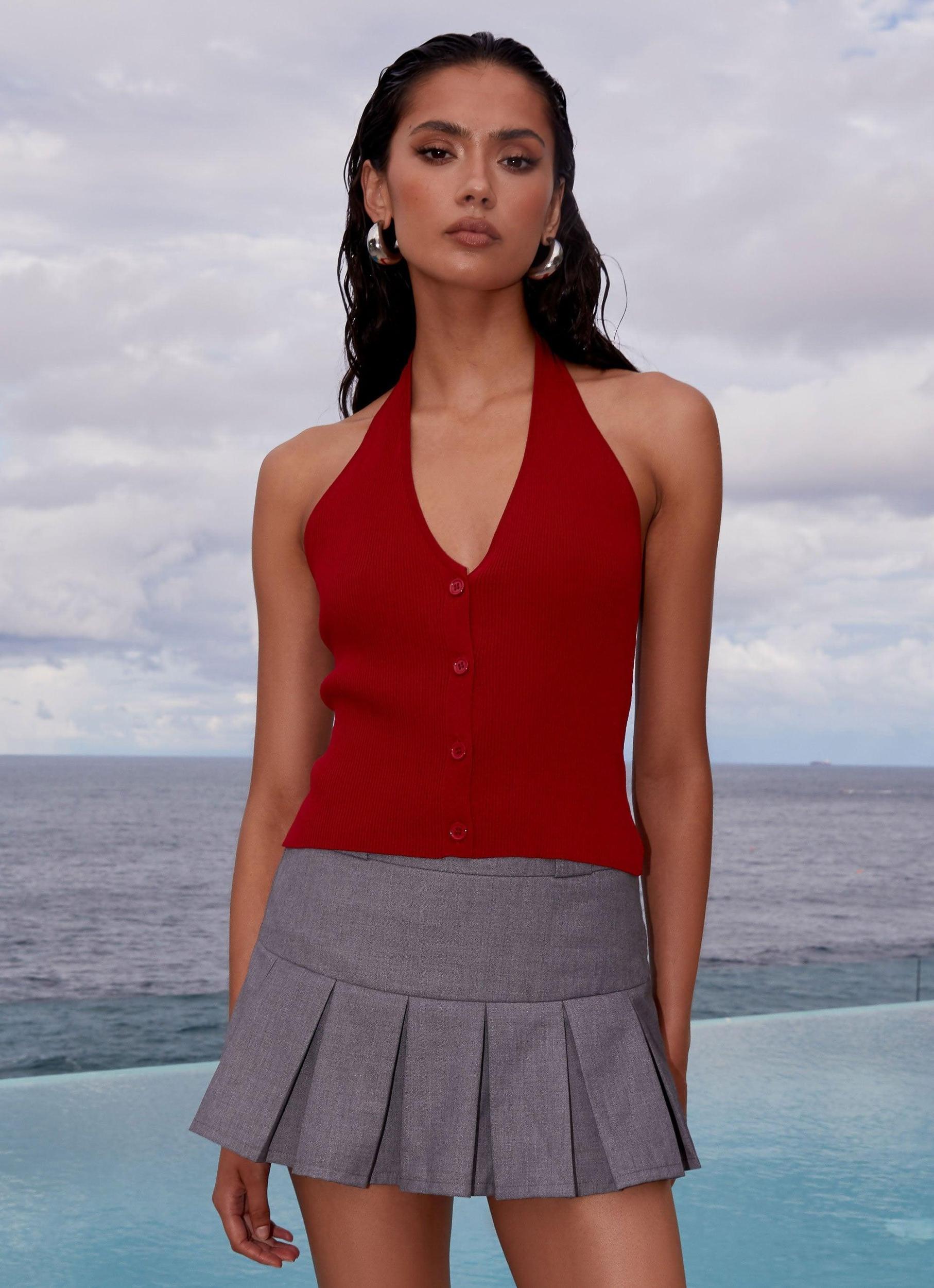 Peppermayo Exclusive Indulge in the allure of the night with our Bettie Knit Halter Top. Featuring a flattering V neckline and an alluring open back, this top is designed for those who come alive after dusk. - Mid-length top- Unlined- Halter neck- V neckline- Open back- Front button closure- Knit material- 100% Cotton Size AU 8 / US 4 garment measurements: Waist 66cmLength 52cmBust 70cm Olivia wears size AU 8 / size US 4