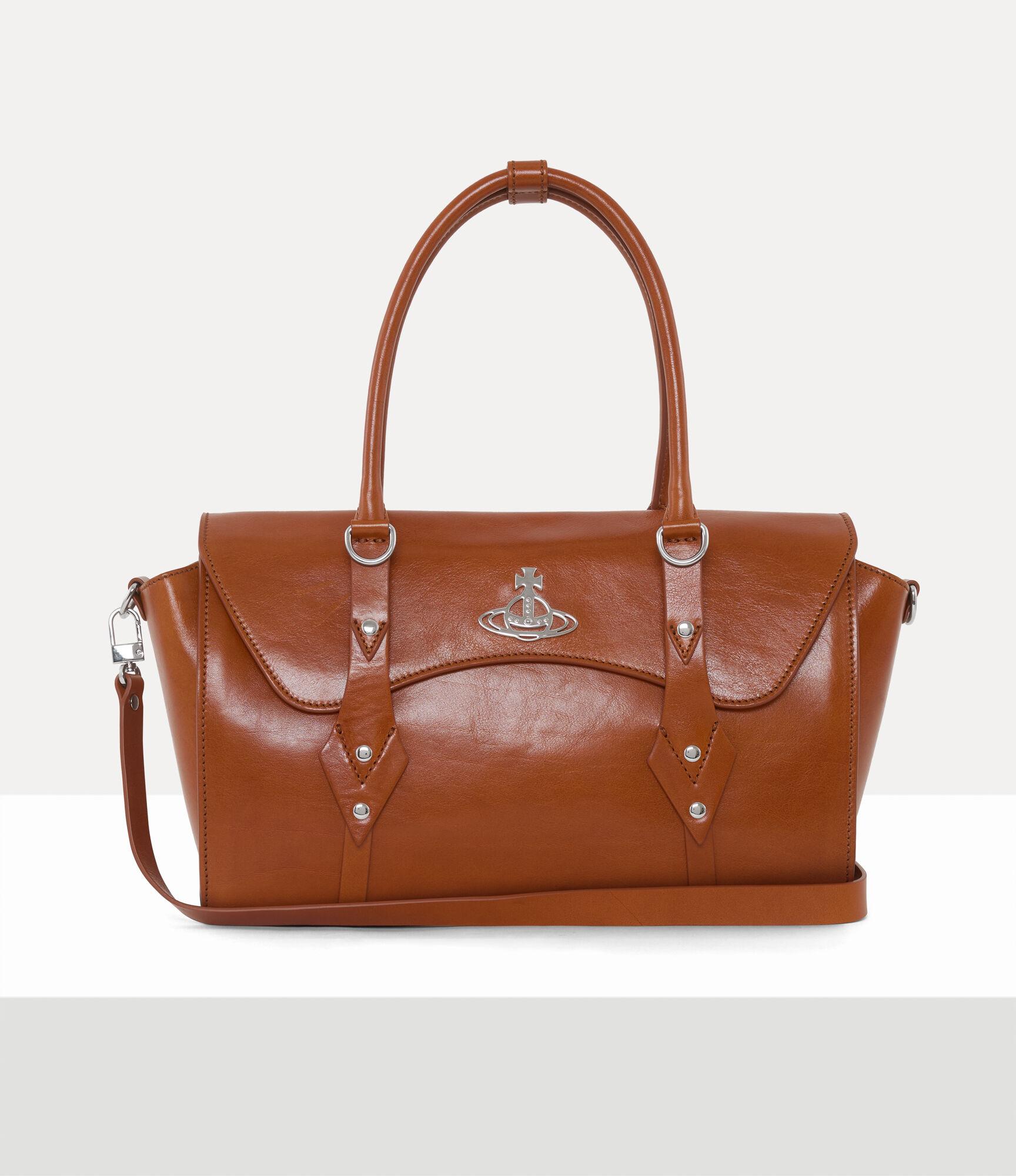 Our Bettina Medium handbag is crafted from shiny, vegetable-tanned leather, detailed with bondage-inspired brass hardware. The D-ring details on the handles allow for the addition of customisable charms, while the structured front flap is finished with the house’s signature 'Line Orb' motif.