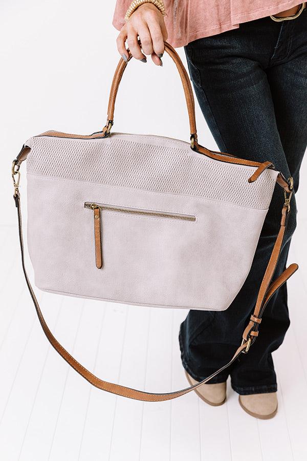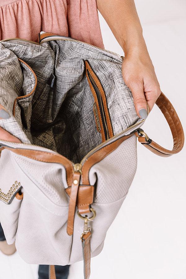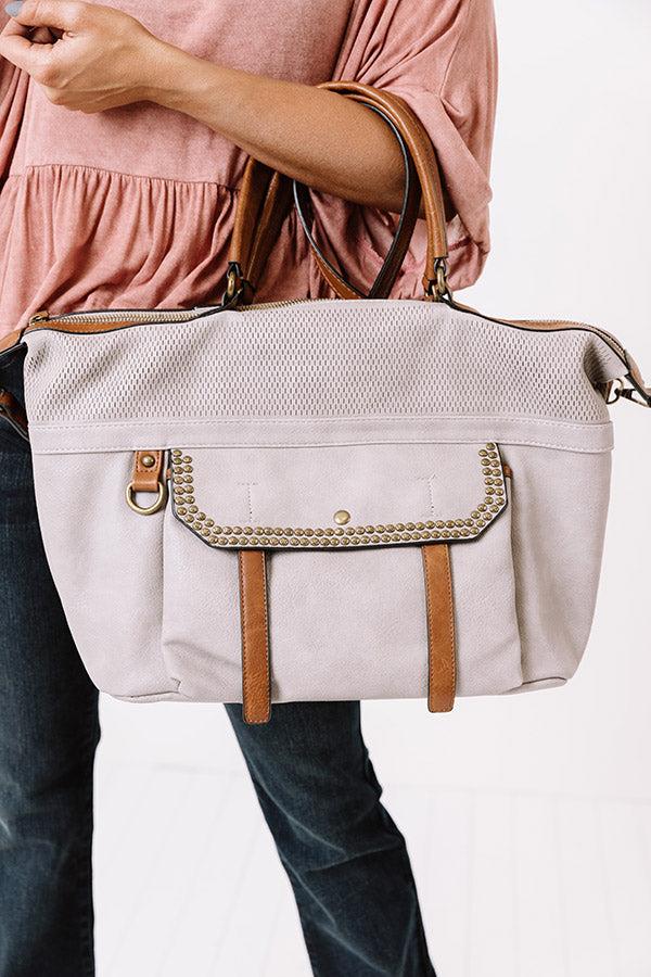 The tote that totally does it all! The 'Betting On Brunch Faux Leather Tote' in grey features tons of storage, a weekender shape, handles and an adjustable strap. The front face features an outer pocket with magnetic closer, gold hardware, key ring, studded flap, and faux leather straps. The back features a zippered pocket for additional storage. The inner enclosure is stitched in a neutral 'line' print and has mutliple pockets and another zipper compartment. This tote also features perforated front and back design.
