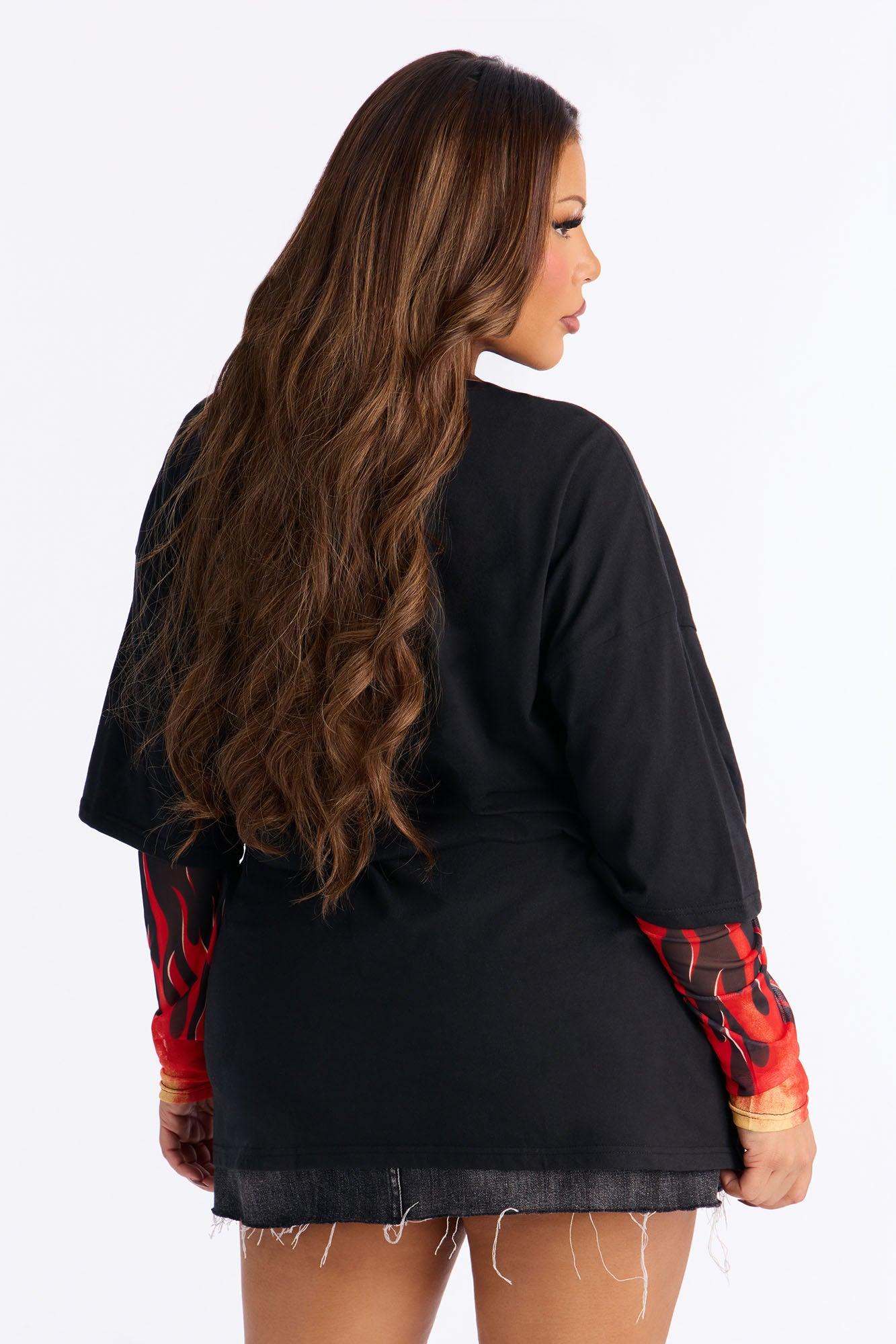 Available In Black. TShirt Twofer Long Sleeve Crew Neck Graphic Mesh Sleeves Front Graphic Distressed Disclaimer: Due To The Printing Process A Difference In Saturation May Occur. Each Garment Is Unique. Self: 60% Cotton 40% Polyester Imported