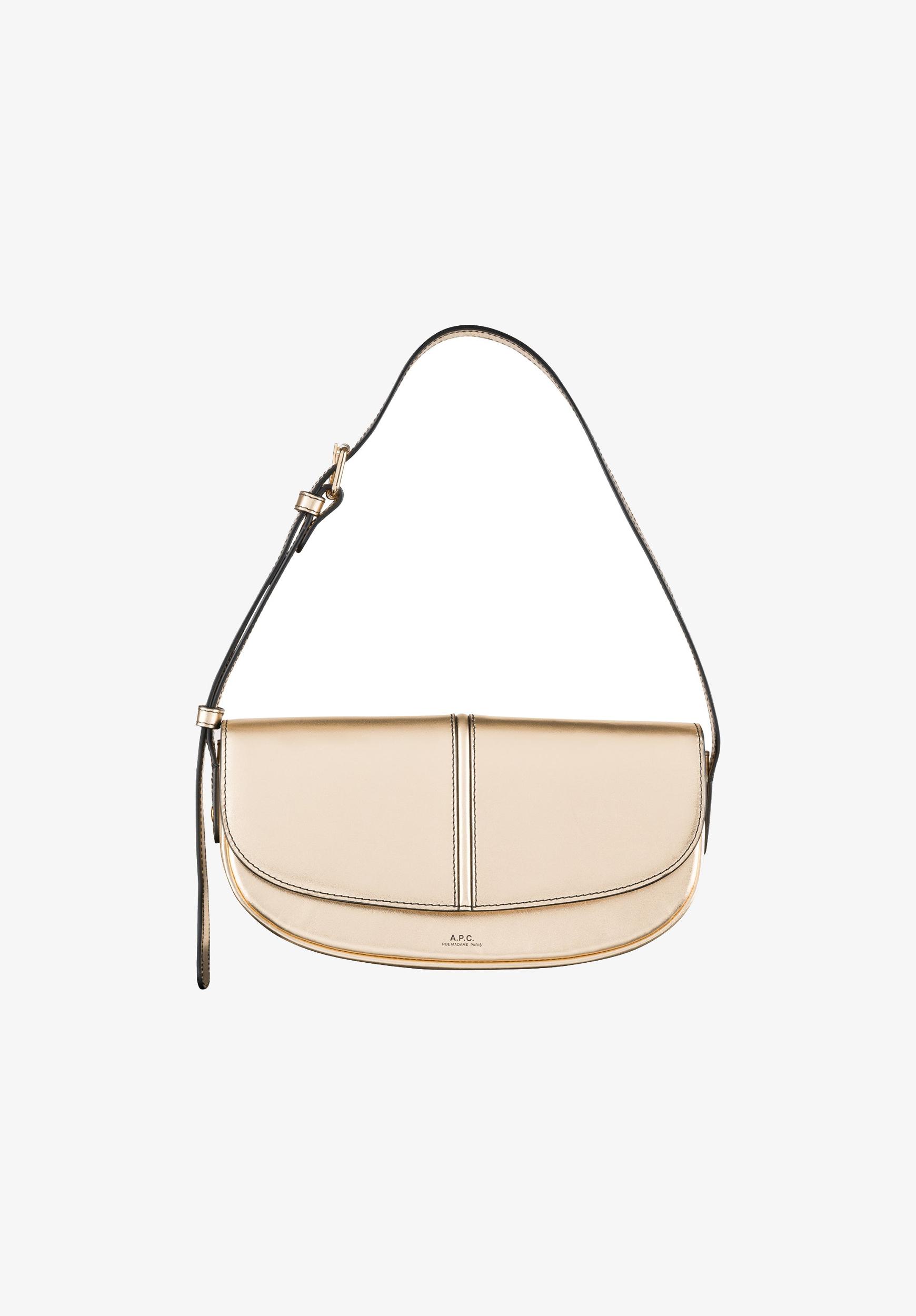 - Bag in smooth metallic leather.- Signature trim of the Betty line on the front.- Magnetic snap flap closure.- Interior pocket.- Shoulder strap adjusts with metal buckle.- May be carried on shoulder or by hand.- Embossed 'A.P.C. Rue Madame Paris' logo.