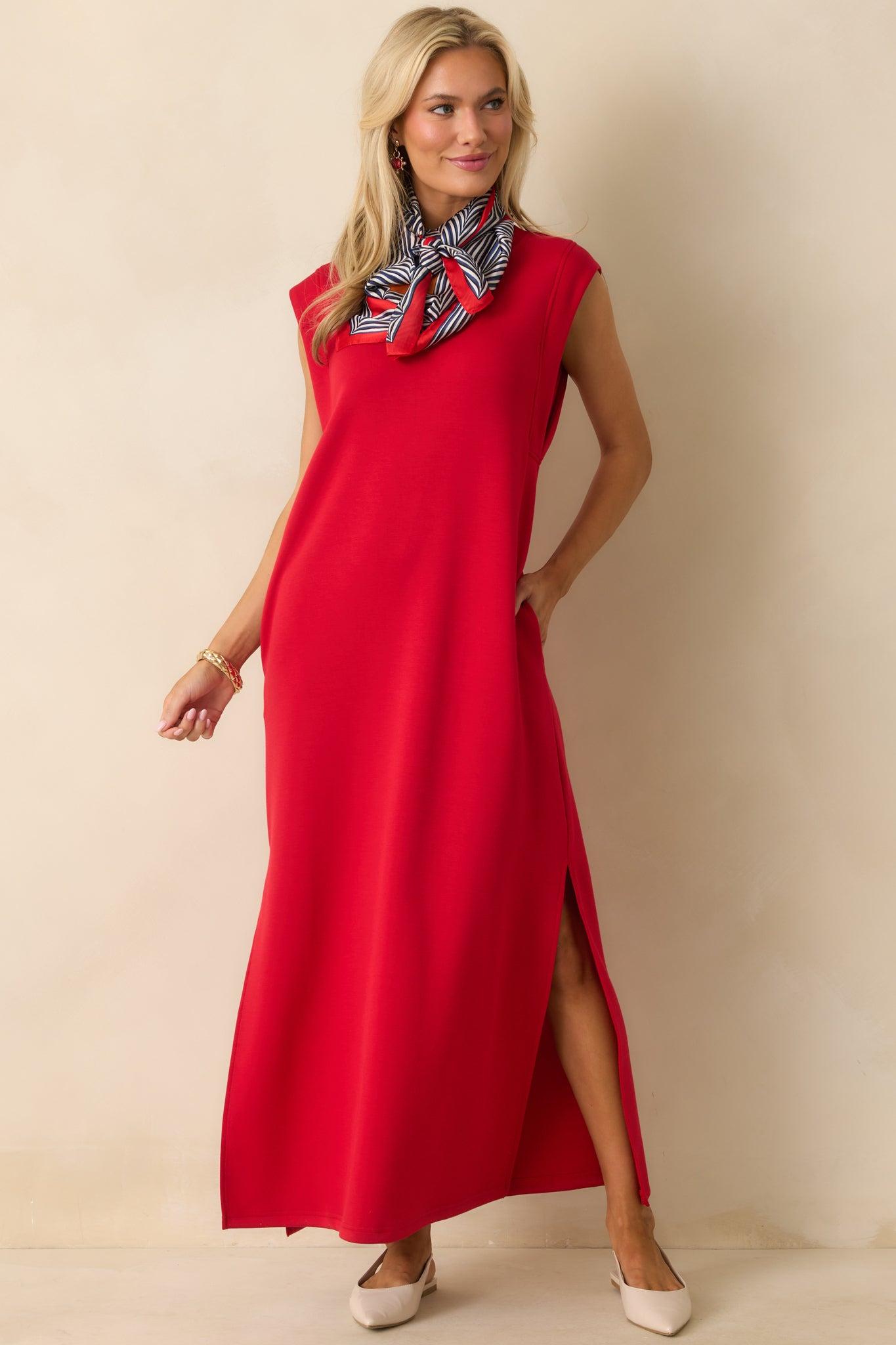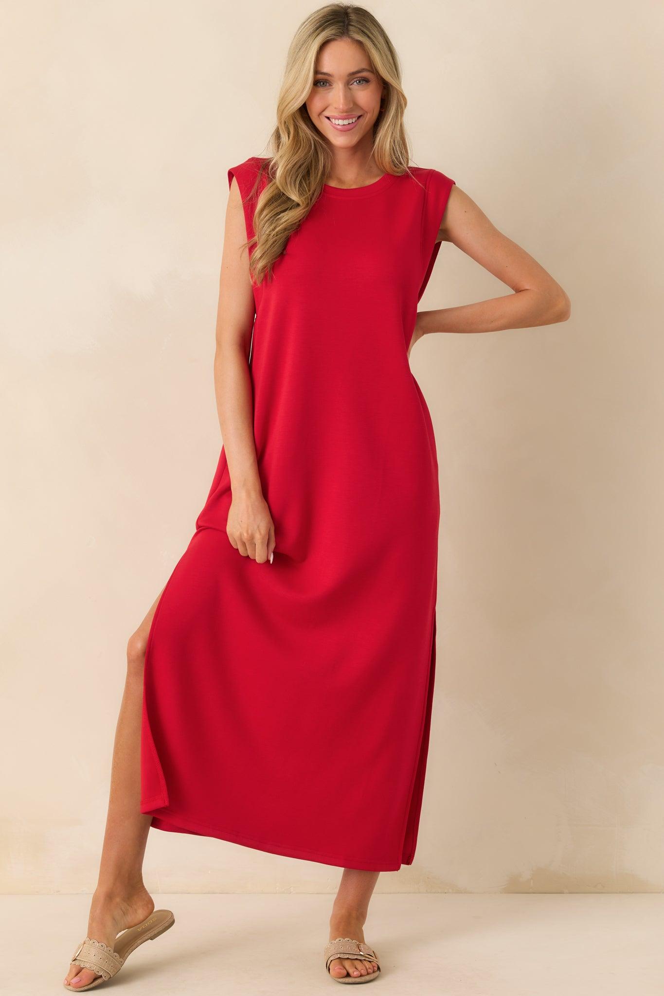 The Between Now And Then Red Cotton Sleeveless Maxi Dress is made for everything in the middle—quiet mornings, weekend plans, and all the little moments that make up your day. It’s an easy, thoughtful choice when you want to feel relaxed but still pulled together. This red maxi dress features a crew neckline, short cap sleeves, side hem slits, relaxed fit, ultra-soft cotton blend fabric, and functional pockets.