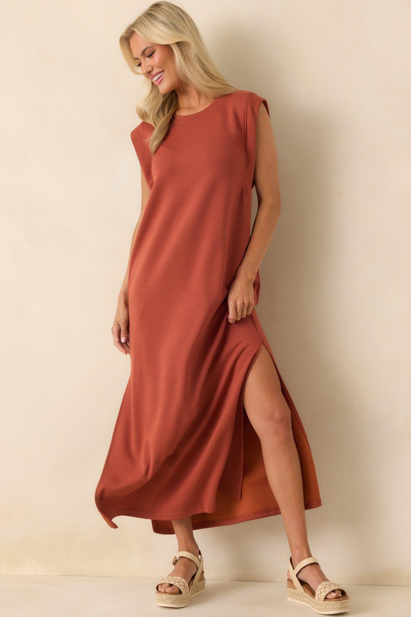 The Between Now And Then Terracotta Cotton Sleeveless Maxi Dress is made for everything in the middle—quiet mornings, weekend plans, and all the little moments that make up your day. It’s an easy, thoughtful choice when you want to feel relaxed but still pulled together. This terracotta orange maxi dress features a crew neckline, short cap sleeves, side hem slits, relaxed fit, ultra-soft cotton blend fabric, and functional pockets.