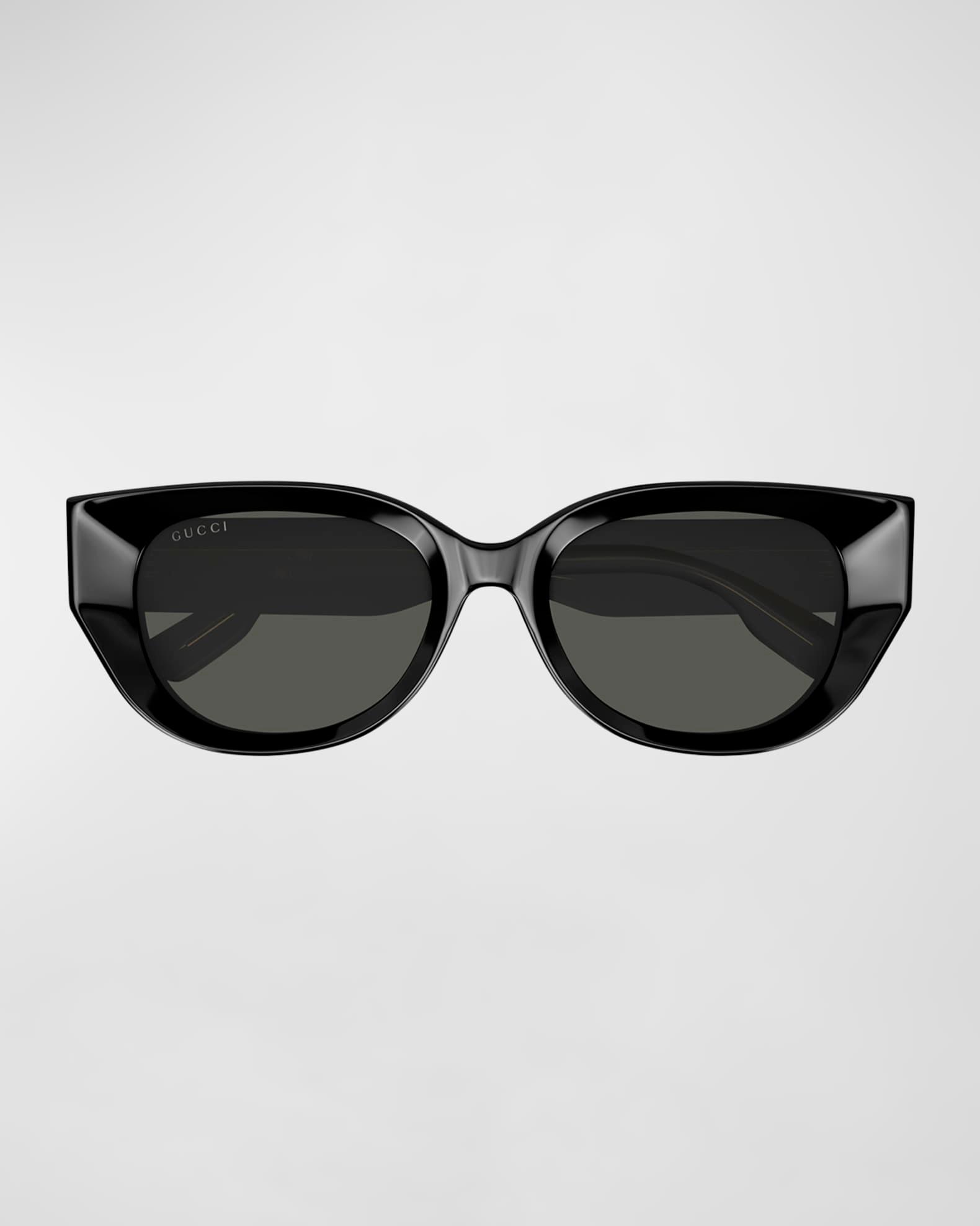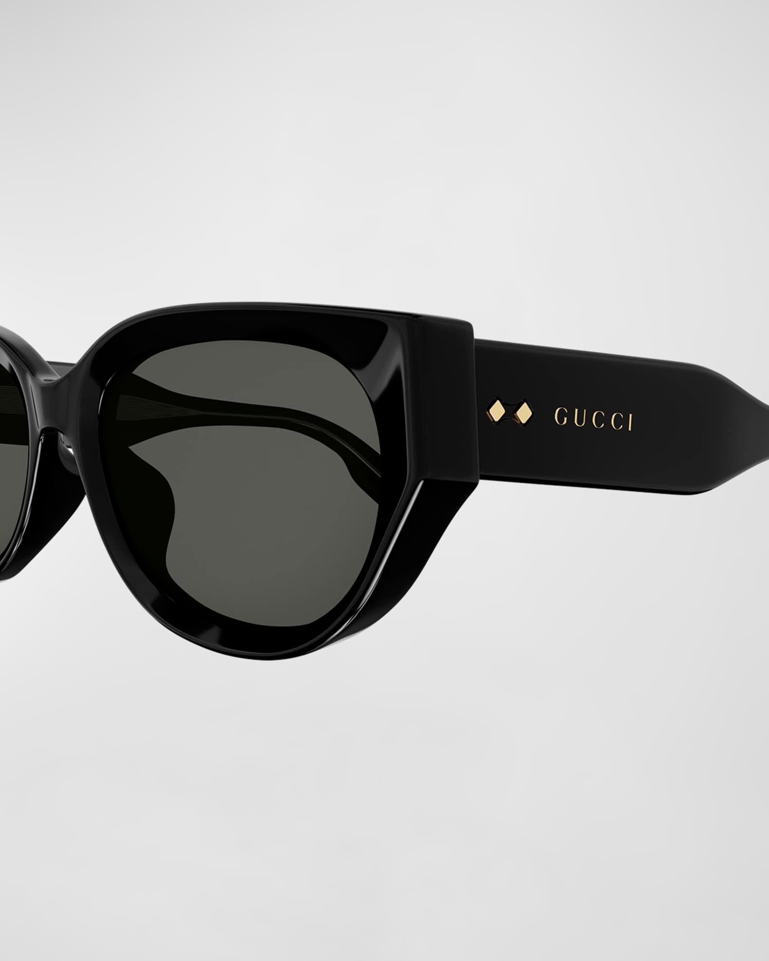 Gucci "GG1532S" beveled cat-eye sunglasses in recycled acetate and Amni® nylon Lens/bridge/temple (in mm): 51-16-140 Solid lenses; logo on corner Saddle nose bridge Logo on temples Wide, tapered arms 100% UVA/UVB protection Made in Italy Proposition 65 warning for California residents This product contains perfluoroalkyl and polyfluoroalkyl substances (PFAS). For more information, please visit the manufacturer’s website.