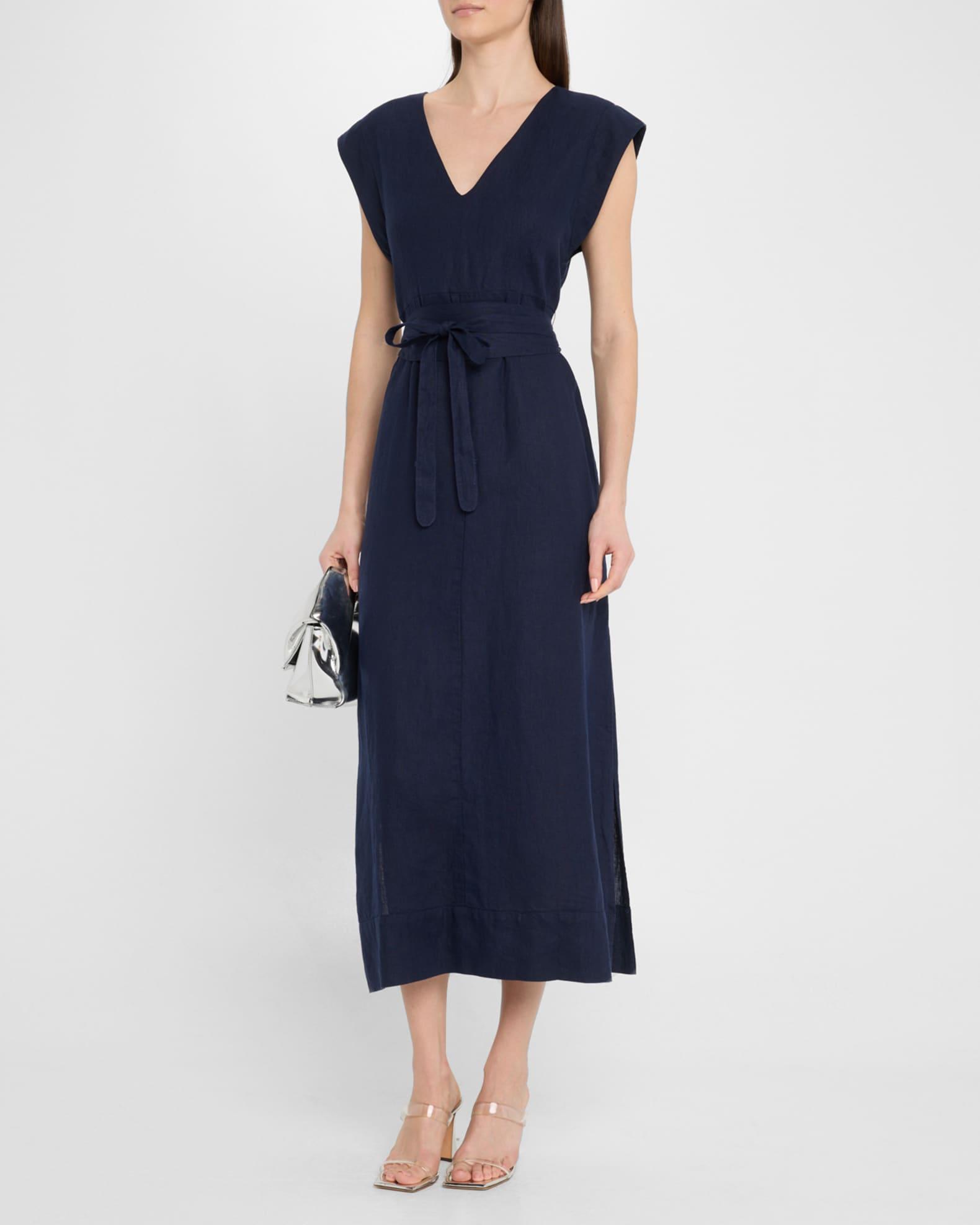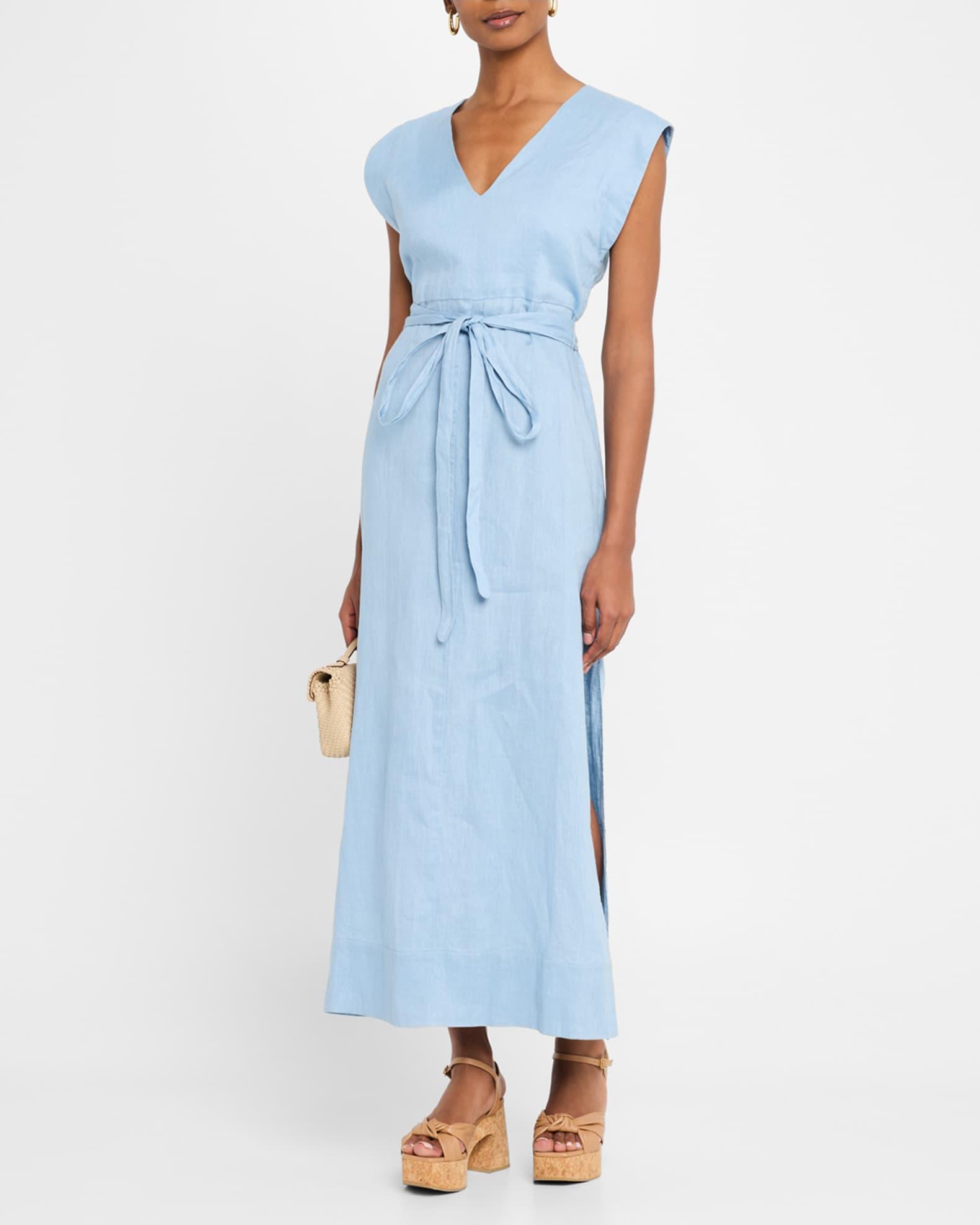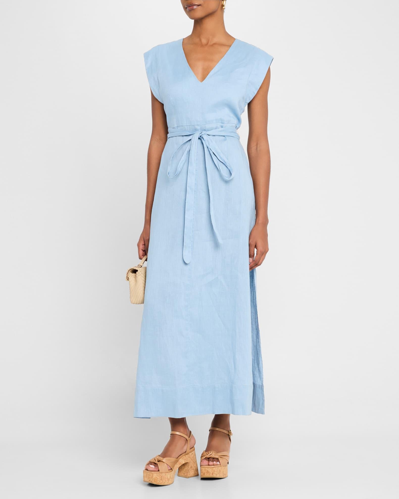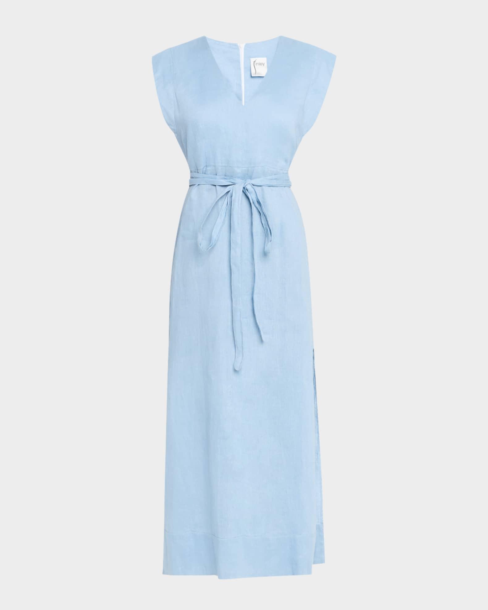 Finley "Beverly" midi dress in washed linen Approx. 52"L from shoulders to hem V neckline Sleeveless Waist self-tie Side slit hem; approx. 22"L Hem falls below the knee A-line silhouette Invisible back zipper Linen Lining: Cotton Machine wash cold Made in the USA from imported materials