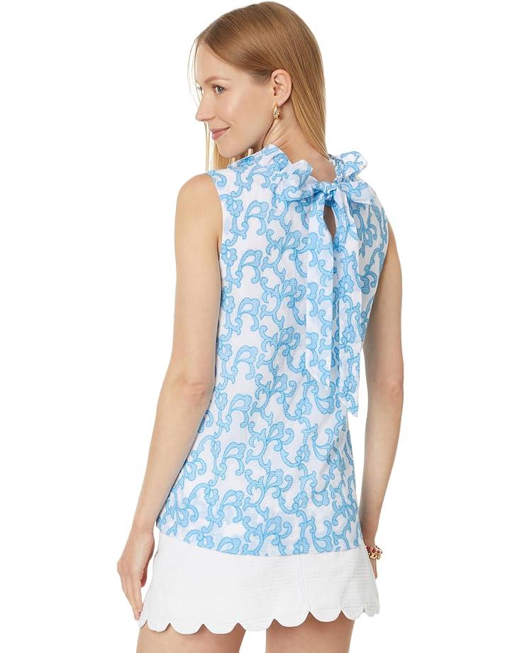 Exude fashionable vibes while enjoying the soft touch of comfort wearing the Lilly Pulitzer® Dahliana Embroidered Cotton Top. With its easy fit and bra-friendly design, the top is ideal for daily wear. The pull-on style top features a sleeveless design, high ruffled neckline, functional back neck tie, an allover floral print, and a standard-length silhouette.