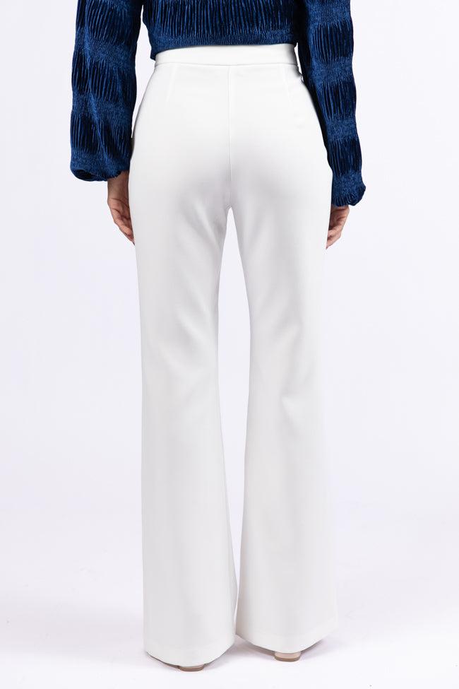 Details White Flare Trousers Fabric has no stretch Zipper closure, non-functional pockets Pair these pants with a top and heels! Unlined Size small from shoulder to hem: 40" Material and Care 95% polyester 5% elastane Machine wash cold, no drum drying Patterns may vary Materials may have natural variations Colors may vary from different viewing devices.