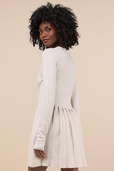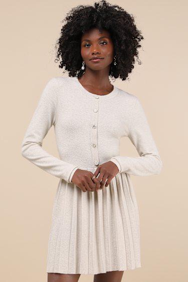 From brunch with the babes to holiday get-togethers, the Lulus Beyond Sweet Heathered Beige Pearl Pleated Mini Sweater Dress will always be admired! Stretchy sweater knit (with a heathered effect throughout) shapes this perfect little dress with a crew neckline, long sleeves, and a bodice with a dazzling, faux pearl and rhinestone button placket. The high, fitted waist sits atop a pleated skater skirt with a cute mini hem.