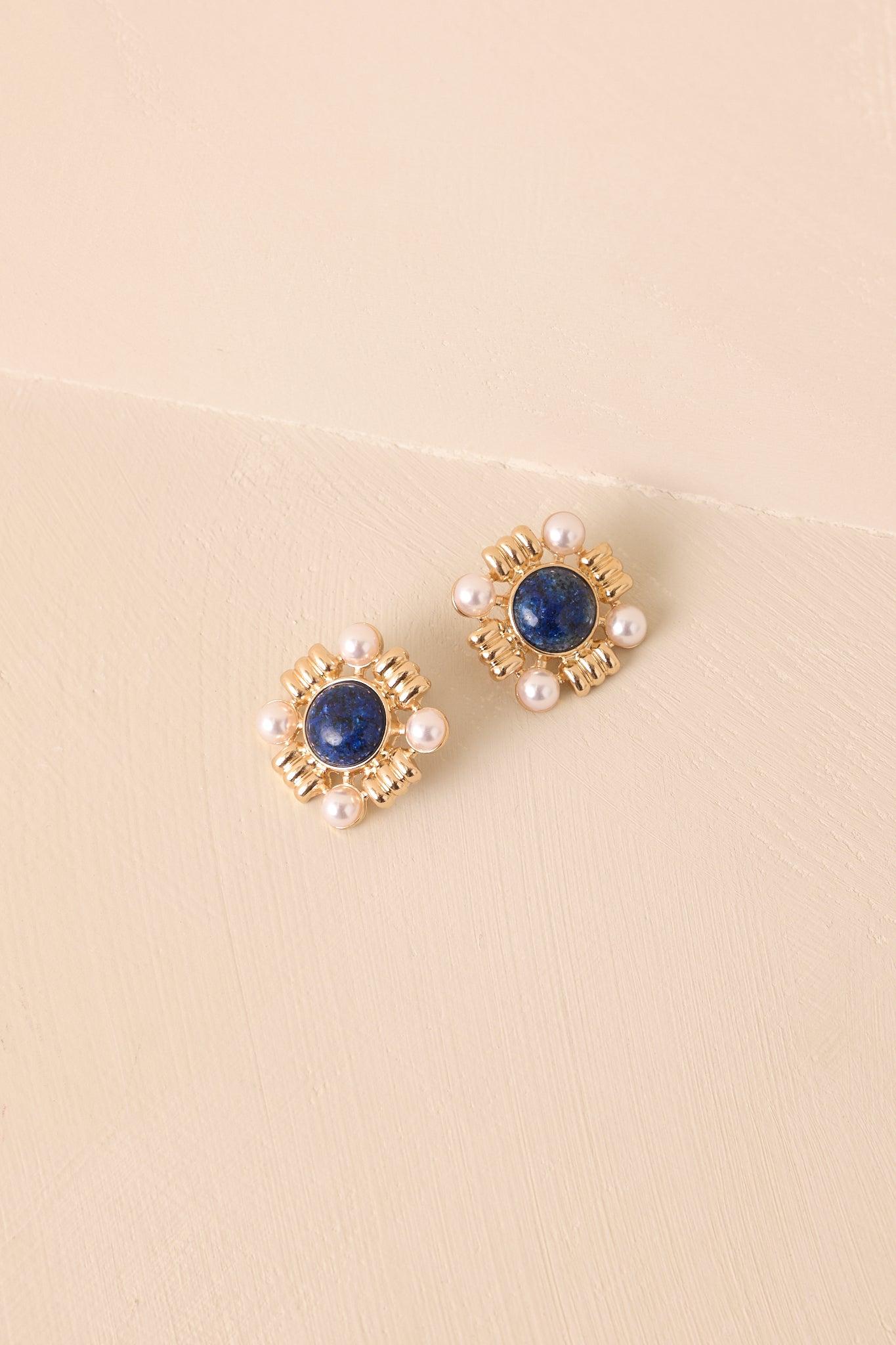 Elevate your style with the Beyond The Waters Gold Square Navy Stone Earrings. Featuring a striking navy stone set in a sleek gold square frame, these earrings add a touch of sophistication to any outfit. Perfect for both everyday wear and special occasions, they effortlessly blend classic elegance with modern design to highlight your unique charm. These navy stone earrings feature a square design, with four faux pearls in each corner and textured gold pieces in between, a navy marble round stone in the middle, and secure back postings.