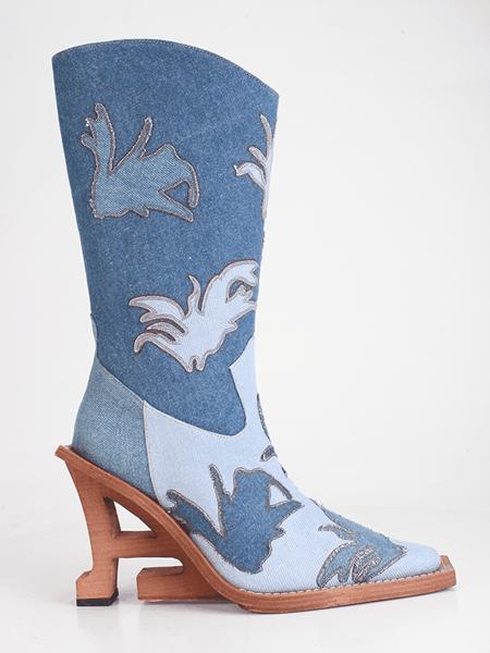 Description: Introducing a new silhouette with the Bhana Cowboy boot made from tonal patchwork denim. Designed with the signature 'A' wedge featuring contrast applique flower motifs, and pointed square toe. Sizing: Click here for size guide. For further sizing assistance please contact us on