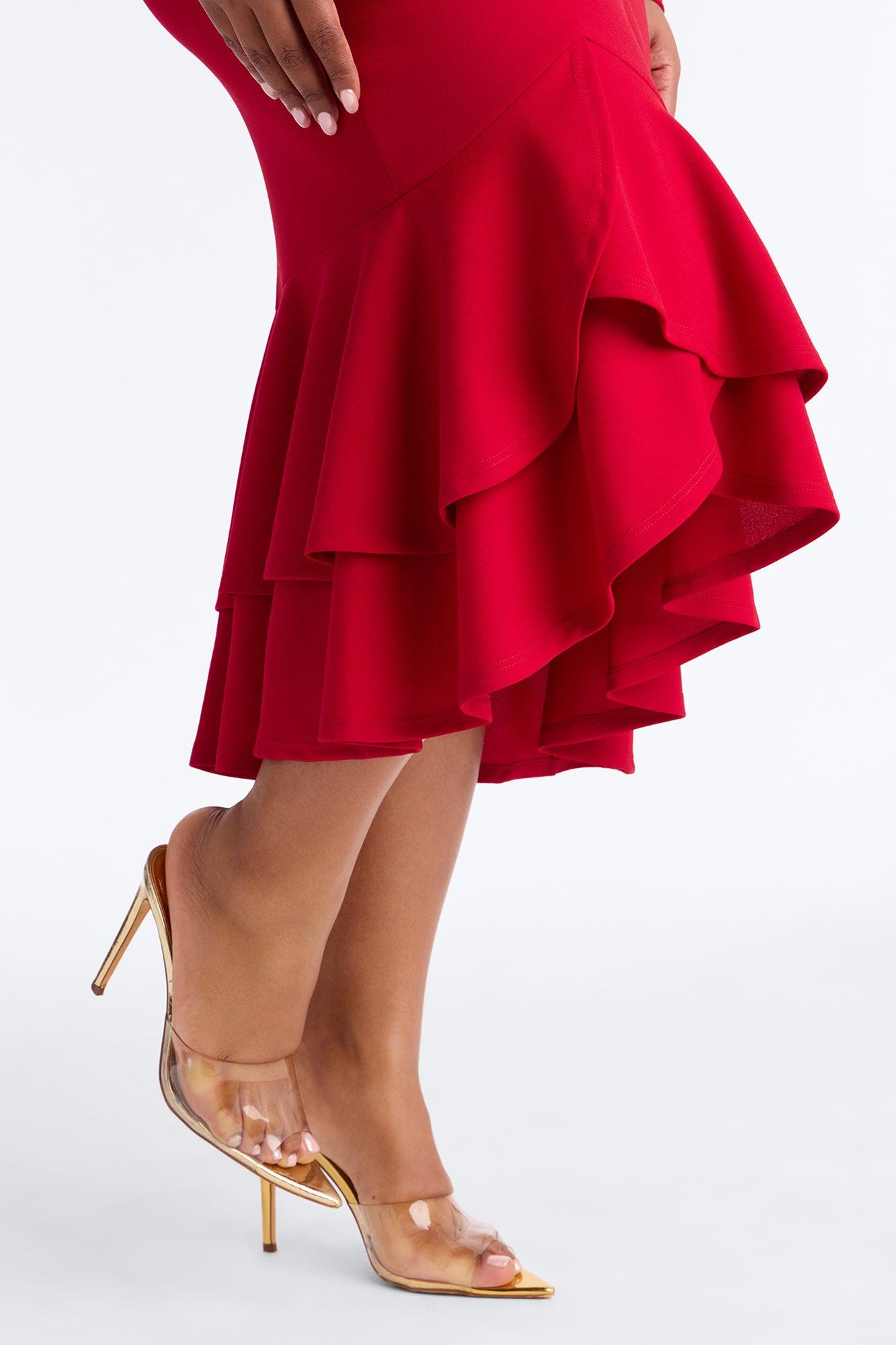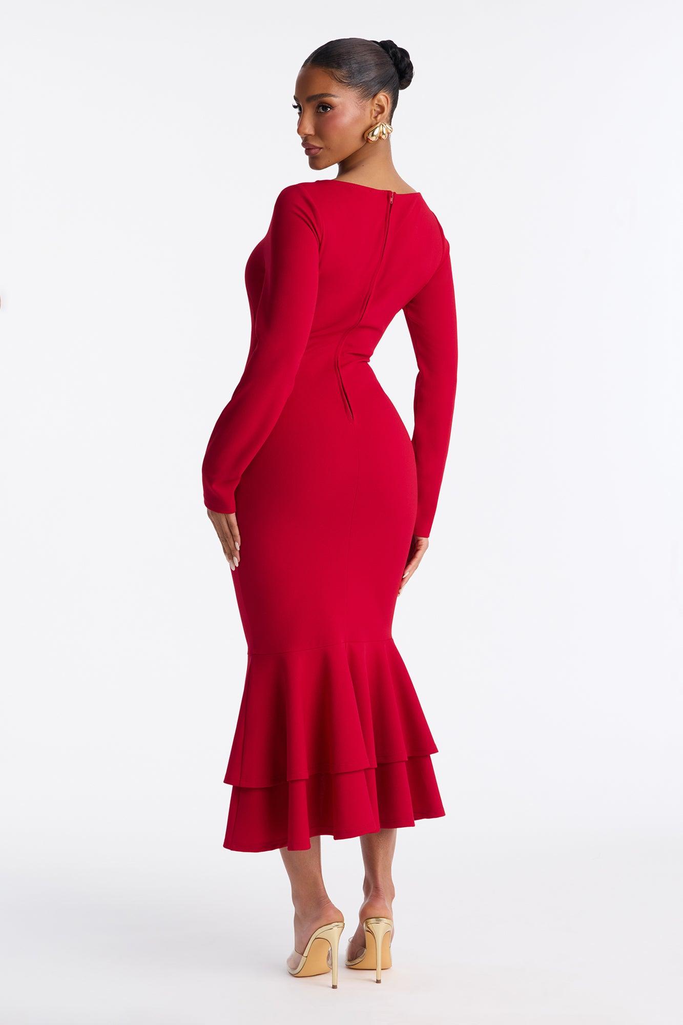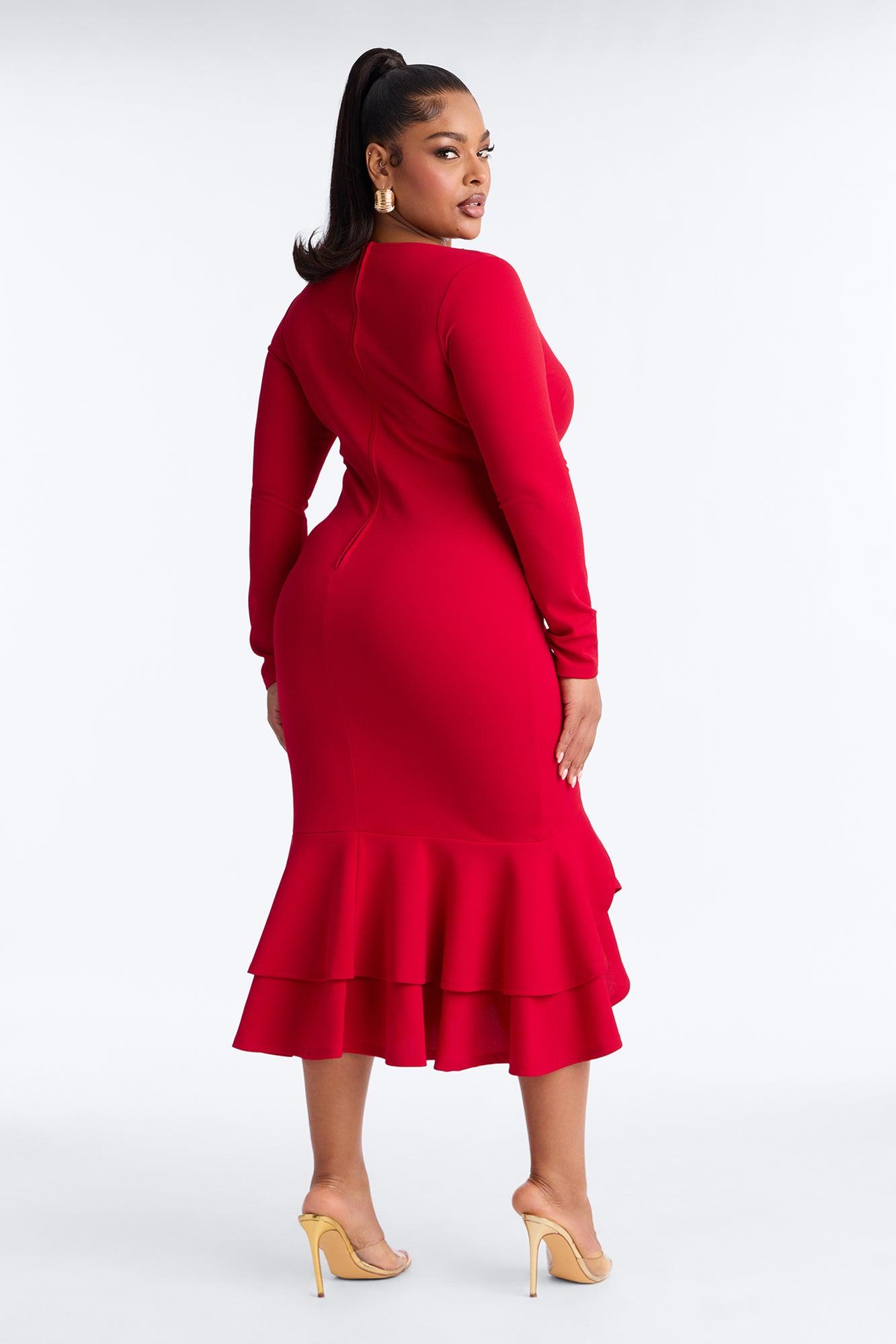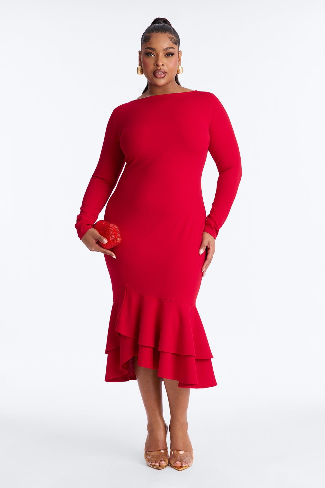 Available In Black, Hunter, Red And Royal. Midi Dress Boat Neckline Long Sleeve Tiered Peplum Zipper Stretch Length Measured Flat = 46" Self : 95% Polyester 5% Spandex Imported California Proposition 65WARNING: Cancer and Reproductive Harm - www.P65Warnings.ca.gov.